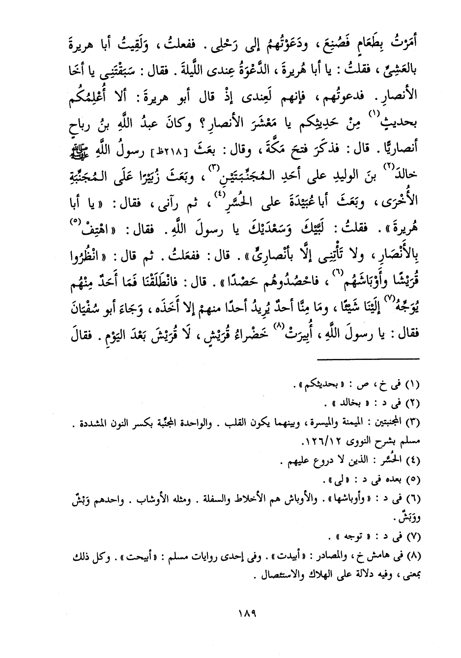 وَبَعَثَ زُبَيْرًا عَلَى الْمُجَنِّبَةِ الأُخْرَى، وَبَعَثَ أَبَا عُبَيْدَةَ عَلَى الْحُسَّرِ، ثُمَّ رَآنِي فَقَالَ: يَا أَبَا هُرَيْرَةَ، فَقُلْتُ: لَبَّيْكَ وَسَعْدَيْكَ يَا رَسُولَ اللهِ، فَقَالَ: اهْتِفْ بِالأَنْصَارِ، وَلاَ تَأْتِنِي إِلاَّ بِأَنْصَارِيٍّ، قَالَ: فَفَعَلْتُ، ثُمَّ قَالَ: انْظُرُوا قُرَيْشًا وَأَوْبَاشَهُمْ فَاحْصُدُوهُمْ حَصْدًا، قَالَ: فَانْطَلَقْنَا، فَمَا أَحَدٌ مِنْهُمْ يُوَجِّهُ إِلَيْنَا شَيْئًا، وَمَا مِنَّا أَحَدٌ يُرِيدُ أَحَدًا مِنْهُمْ إِلاَّ أَخَذَهُ، وَجَاءَ أَبُو سُفْيَانَ فَقَالَ: يَا رَسُولَ اللهِ، أُبِيرَتْ خَضْرَاءُ قُرَيْشٍ، لاَ قُرَيْشَ بَعْدَ الْيَوْمِ، فَقَالَ رَسُولُ اللهِ صَلَّى الله عَلَيْهِ وَسَلَّمَ: مَنْ دَخَلَ دَارَ أَبِي سُفْيَانَ فَهُوَ آمِنٌ، وَمَنْ أَلْقَى السِّلاَحَ فَهُوَ آمِنٌ، فَأَلْقَى النَّاسُ سِلاَحَهُمْ، وَدَخَلَ رَسُولُ اللهِ صَلَّى الله عَلَيْهِ وَسَلَّمَ فَبَدَأَ بِالْحَجَرِ فَاسْتَلَمَهُ ثُمَّ طَافَ سَبْعًا،