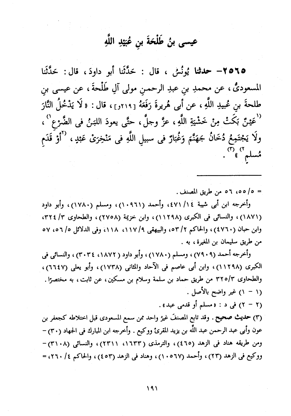 2565 - حَدَّثَنَا يُونُسُ قَالَ: حَدَّثَنَا أَبُو دَاوُدَ قَالَ: حَدَّثَنَا الْمَسْعُودِيُّ، عَنْ مُحَمَّدِ بْنِ عَبْدِ الرَّحْمَنِ مَوْلَى آلِ طَلْحَةَ، عَنْ عِيسَى بْنِ طَلْحَةَ بْنِ عُبَيْدِ اللَّهِ، عَنْ أَبِي هُرَيْرَةَ، رَفَعَهُ قَالَ: «§لَا يَدْخُلُ النَّارَ عَيْنٌ بَكَتْ مِنْ خَشْيَةِ اللَّهِ عَزَّ وَجَلَّ حَتَّى يَعُودَ اللَّبَنُ فِي الضَّرْعِ وَلَا يَجْتَمِعُ دُخَانُ جَهَنَّمَ وَغُبَارٌ فِي سَبِيلِ اللَّهِ فِي مَنْخِرَيْ عَبْدٍ أَوْ قَدَمِ مُسْلِمٍ»