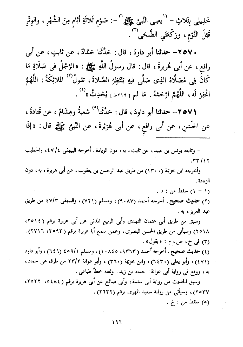 2570 - حَدَّثَنَا أَبُو دَاوُدَ قَالَ: حَدَّثَنَا حَمَّادٌ، عَنْ ثَابِتٍ، عَنْ أَبِي رَافِعٍ، عَنْ أَبِي هُرَيْرَةَ، قَالَ: قَالَ رَسُولُ اللَّهِ صَلَّى اللهُ عَلَيْهِ وَسَلَّمَ: " §الرَّجُلُ فِي صَلَاةٍ مَا كَانَ فِي مُصَلَّاهُ الَّذِي صَلَّى فِيهِ يَنْتَظِرُ الصَّلَاةَ تَقُولُ الْمَلَائِكَةُ: اللَّهُمَّ اغْفِرْ لَهُ، اللَّهُمَّ ارْحَمْهُ، مَا لَمْ يُحْدِثْ "