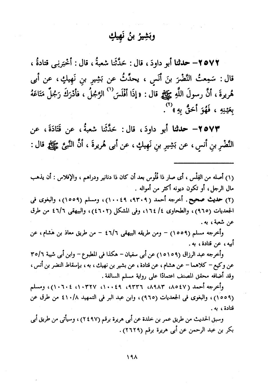 2572 - حَدَّثَنَا أَبُو دَاوُدَ قَالَ: حَدَّثَنَا شُعْبَةُ، قَالَ: أَخْبَرَنِي قَتَادَةُ قَألَ: سَمِعْتُ النَّضْرَ بْنَ أَنَسٍ، يُحَدِّثُ عَنْ بَشِيرِ بْنِ نَهِيكٍ، عَنْ أَبِي هُرَيْرَةَ، أَنَّ رَسُولَ اللَّهِ صَلَّى اللهُ عَلَيْهِ وَسَلَّمَ قَالَ: «§إِذَا أَفْلَسَ الرَّجُلُ فَأَدْرَكَ رَجُلٌ مَتَاعَهُ بِعَيْنِهِ فَهُوَ أَحَقُّ بِهِ»