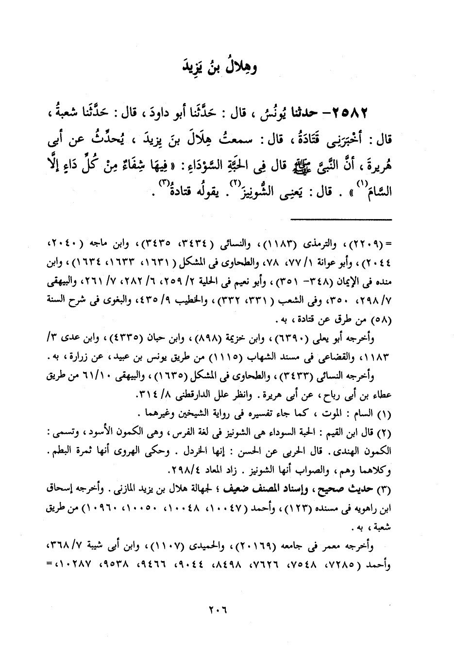 2582 - حَدَّثَنَا يُونُسُ قَالَ: حَدَّثَنَا أَبُو دَاوُدَ قَالَ: حَدَّثَنَا شُعْبَةُ، قَالَ: حَدَّثَنِي قَتَادَةُ، قَالَ: سَمِعْتُ هِلَالَ بْنَ يَزِيدَ، يُحَدِّثُ عَنْ أَبِي هُرَيْرَةَ، أَنَّ النَّبِيَّ صَلَّى اللهُ عَلَيْهِ وَسَلَّمَ قَالَ فِي الْحَبَّةِ السَّوْدَاءِ: «§فِيهَا شِفَاءٌ مِنْ كُلِّ دَاءٍ إِلَّا السَّامَ» قَالَ: يَعْنِي الشُّونِيزَ يَقُولُهُ قَتَادَةُ