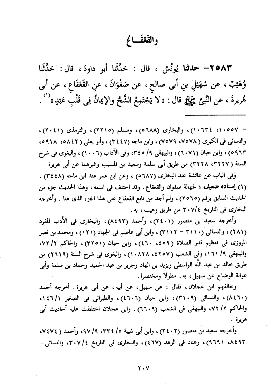 2583 - حَدَّثَنَا يُونُسُ قَالَ: حَدَّثَنَا أَبُو دَاوُدَ قَالَ: حَدَّثَنَا وُهَيْبٌ، عَنْ سُهَيْلِ بْنِ أَبِي صَالِحٍ، عَنْ صَفْوَانَ، عَنِ الْقَعْقَاعِ، عَنْ أَبِي هُرَيْرَةَ، عَنِ النَّبِيِّ صَلَّى اللهُ عَلَيْهِ وَسَلَّمَ قَالَ: «§لَا يَجْتَمِعُ الشُّحُّ وَالْإِيمَانُ فِي قَلْبِ عَبْدٍ»