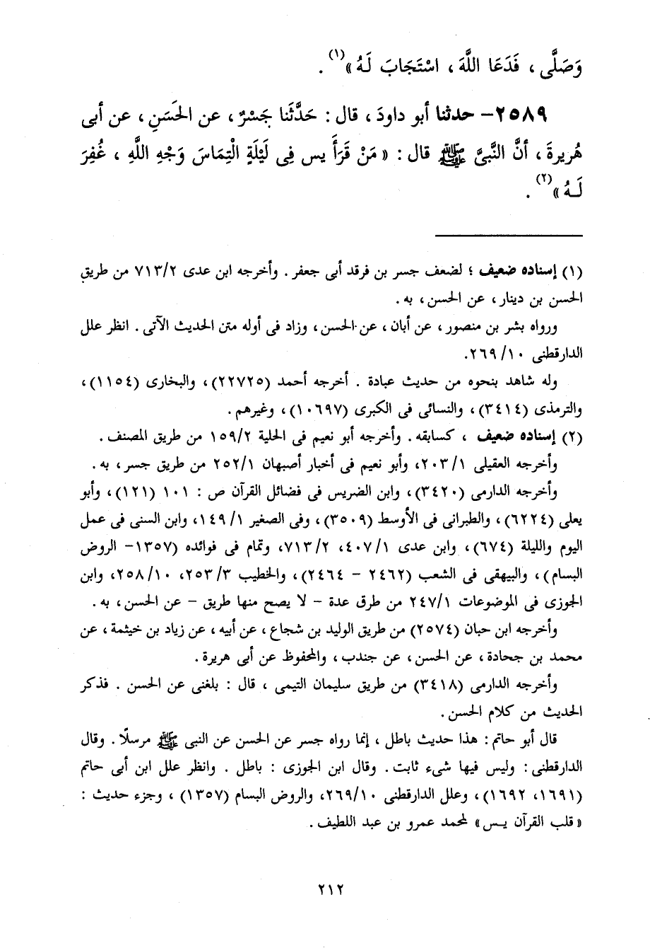 2589 - حَدَّثَنَا أَبُو دَاوُدَ قَالَ: حَدَّثَنَا جَسْرٌ، عَنِ الْحَسَنِ، عَنْ أَبِي هُرَيْرَةَ، أَنَّ النَّبِيَّ صَلَّى اللهُ عَلَيْهِ وَسَلَّمَ قَالَ: " §مَنْ قَرَأَ: يس فِي لَيْلَةٍ الْتِمَاسَ وَجْهِ اللَّهِ غُفِرَ لَهُ "