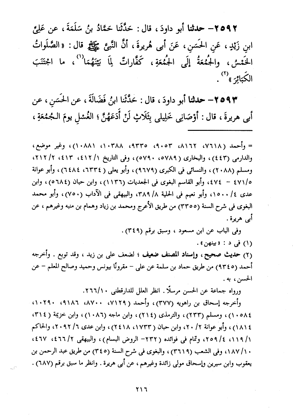 2593 - حَدَّثَنَا أَبُو دَاوُدَ قَالَ: حَدَّثَنَا ابْنُ فَضَالَةَ، عَنِ الْحَسَنِ، عَنْ أَبِي هُرَيْرَةَ، قَالَ: §أَوْصَانِي خَلِيلِي بِثَلَاثٍ لَنْ أَدَعَهُنَّ: «الْغُسْلِ يَوْمَ الْجُمُعَةِ -[217]-، وَالْوِتْرِ قَبْلَ النَّوْمِ، وَصِيَامِ ثَلَاثَةِ أَيَّامٍ مِنَ الشَّهْرِ»