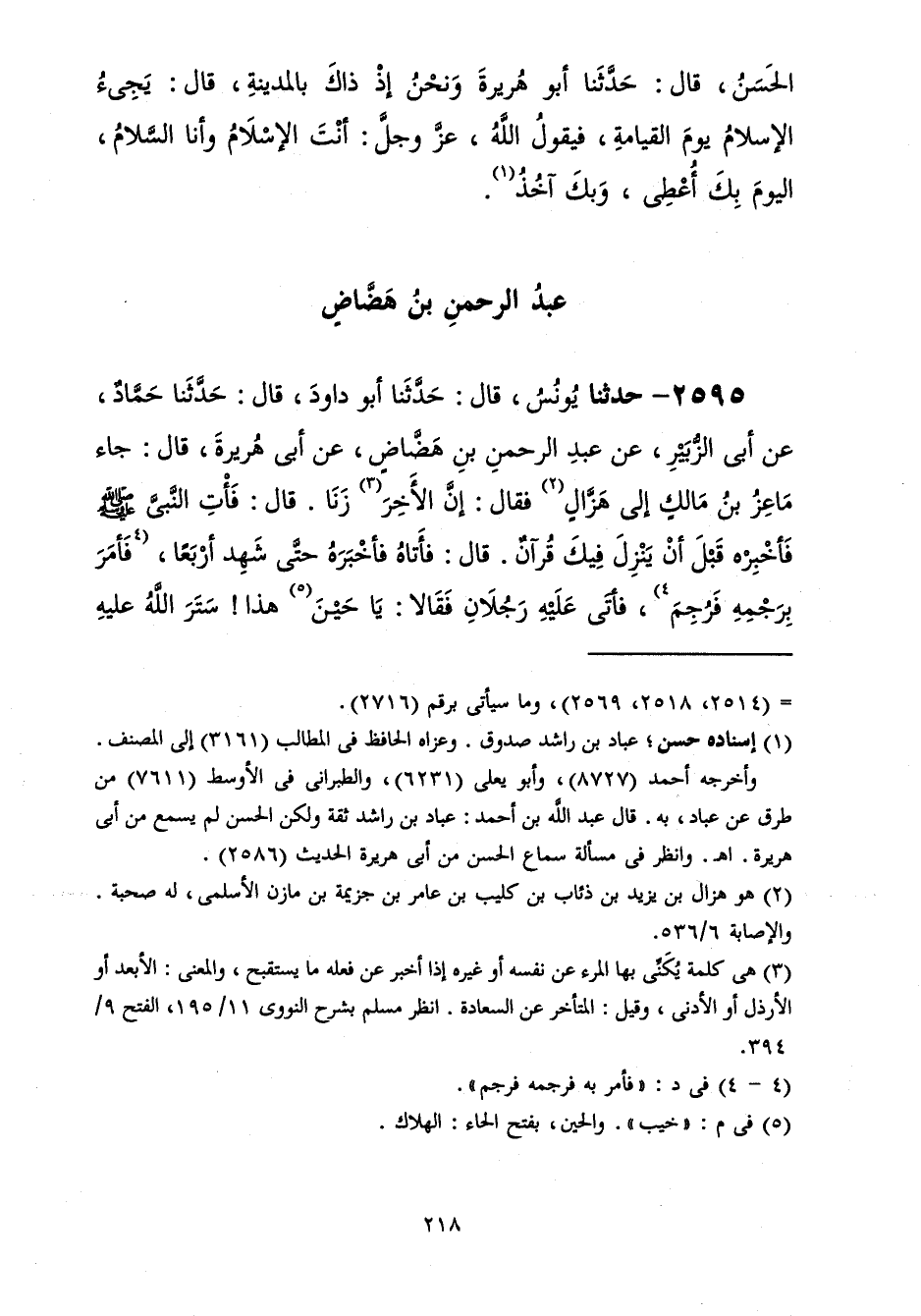 2595 - حَدَّثَنَا يُونُسُ قَالَ: حَدَّثَنَا أَبُو دَاوُدَ قَالَ: حَدَّثَنَا حَمَّادٌ، عَنْ أَبِي الزُّبَيْرِ، عَنْ عَبْدِ الرَّحْمَنِ بْنِ هَضَّاضٍ، عَنْ أَبِي هُرَيْرَةَ، قَالَ: جَاءَ مَاعِزُ بْنُ مَالِكٍ إِلَى هَزَّالٍ فَقَالَ: إِنَّ الْآخِرَ زَنَا قَالَ: فَأْتِ النَّبِيَّ صَلَّى اللهُ عَلَيْهِ وَسَلَّمَ فَأَخْبِرْهُ قَبْلَ أَنْ يَنْزِلَ فِيكَ قُرْآنٌ قَالَ: فَأَتَاهُ، فَأَخْبَرَهُ حَتَّى شَهِدَ أَرْبَعًا، فَأَمَرَ بِرَجْمِهِ فَرُجِمَ، فَأَتَى عَلَيْهِ رَجُلَانِ فَقَالَا: يَا حَيْنَ هَذَا، سَتَرَ اللَّهُ عَلَيْهِ -[219]-، فَلَمْ يَسْتُرْ عَلَى نَفْسِهِ، فَأُهِيجَ كَمَا يُهَيَّجُ الْكَلْبُ فَأَتَيَا النَّبِيَّ صَلَّى اللهُ عَلَيْهِ وَسَلَّمَ، وَإِذَا جِيفَةٌ فَقَالَ النَّبِيُّ صَلَّى اللهُ عَلَيْهِ وَسَلَّمَ: «§انْهَسَا مِنْ هَذِهِ الْجِيفَةِ» فَقَالَا: يَا رَسُولَ اللَّهِ، هَذِهِ جِيفَةٌ وَلَا نَسْتَطِيعُهَا فَقَالَ رَسُولُ اللَّهِ صَلَّى اللهُ عَلَيْهِ وَسَلَّمَ: «مَا أَصَبْتُمَا مِنْ أَخِيكُمَا أَنْتَنُ مِنْ هَذِهِ، فَوَالَّذِي نَفْسِي بِيَدِهِ، لَقَدْ رَأَيْتُهُ يَتَقَمَّصُ فِي نَهَرِ الْجَنَّةِ» وَقَالَ: «أَلَا رَحِمْتَهُ يَا هَزَّالُ»