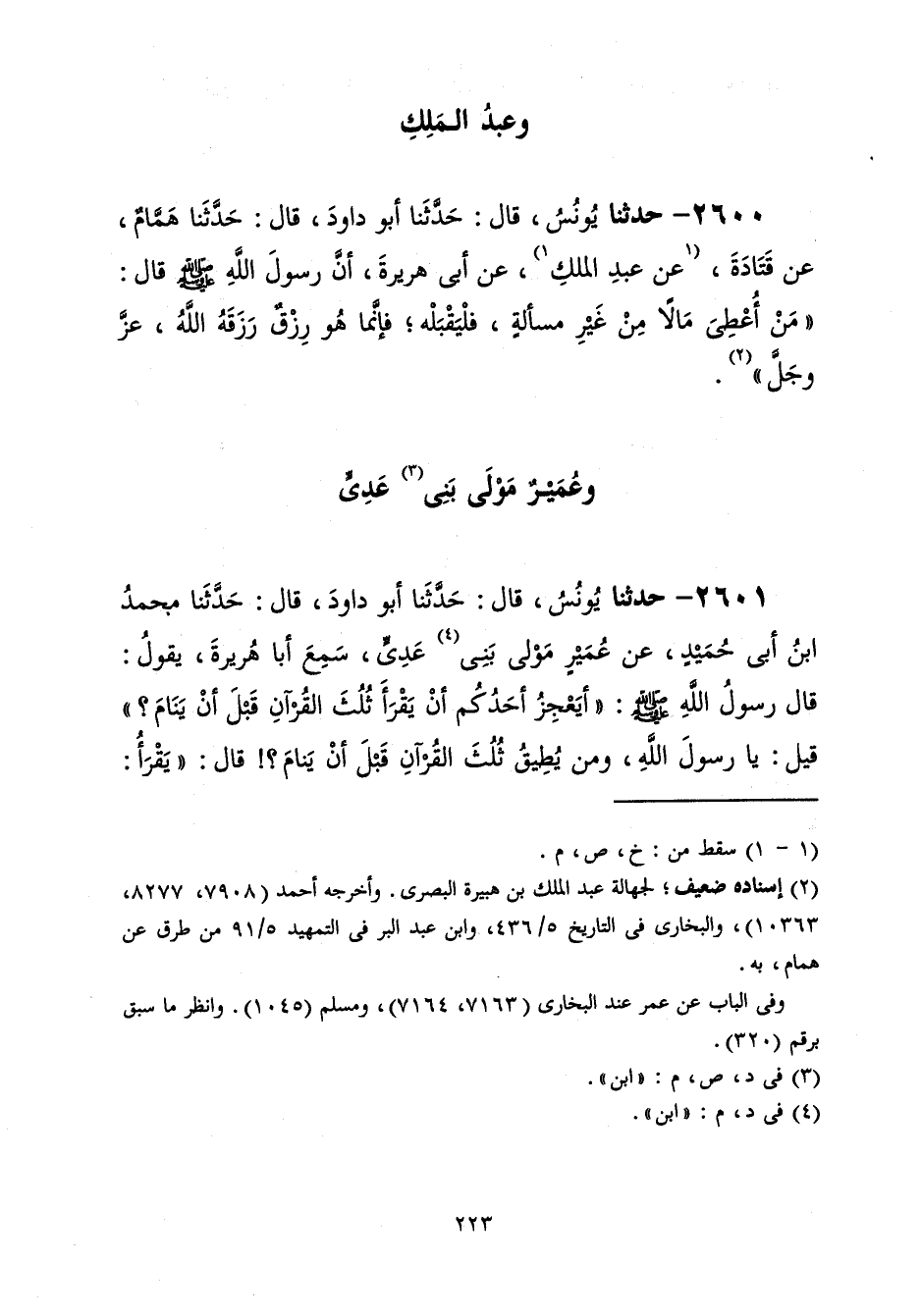 2601 - حَدَّثَنَا يُونُسُ قَالَ: حَدَّثَنَا أَبُو دَاوُدَ قَالَ: حَدَّثَنَا مُحَمَّدُ بْنُ أَبِي حُمَيْدٍ، عَنْ عُمَيْرٍ مَوْلَى بَنِي عَدِيٍّ، سَمِعَ أَبَا هُرَيْرَةَ، يَقُولُ: قَالَ رَسُولُ اللَّهِ صَلَّى اللهُ عَلَيْهِ وَسَلَّمَ: «§أَيَعْجِزُ أَحَدُكُمْ أَنْ يَقْرَأَ ثُلُثَ الْقُرْآنِ قَبْلَ أَنْ يَنَامَ؟» قِيلَ: يَا رَسُولَ اللَّهِ، وَمَنْ يُطِيقُ ثُلُثَ الْقُرْآنِ قَبْلَ أَنْ يَنَامَ؟ قَالَ: " يَقْرَأُ -[224]-: قُلْ هُوَ اللَّهُ أَحَدٌ، وَقُلْ أَعُوذُ بِرَبِّ الْفَلَقِ، وَقُلْ أَعُوذُ بِرَبِّ النَّاسِ، فَكَأَنَّمَا قَرَأَ ثُلُثَ الْقُرْآنِ "