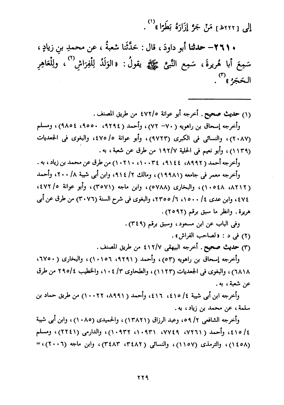 2610 - حَدَّثَنَا أَبُو دَاوُدَ قَالَ: حَدَّثَنَا شُعْبَةُ، عَنْ مُحَمَّدِ بْنِ زِيَادٍ، سَمِعَ أَبَا هُرَيْرَةَ، سَمِعَ النَّبِيَّ صَلَّى اللهُ عَلَيْهِ وَسَلَّمَ يَقُولُ: «§الْوَلَدُ لِلْفِرَاشِ، وَلِلْعَاهِرِ الْحَجَرُ»