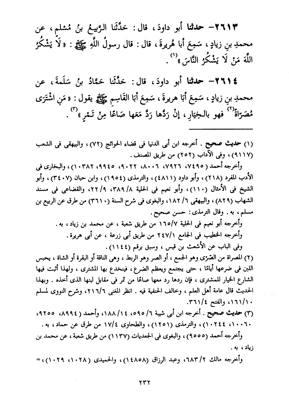 2613 - حَدَّثَنَا أَبُو دَاوُدَ قَالَ: حَدَّثَنَا الرَّبِيعُ بْنُ مُسْلِمٍ، عَنْ مُحَمَّدِ بْنِ زِيَادٍ، سَمِعَ أَبَا هُرَيْرَةَ، قَالَ: قَالَ رَسُولُ اللَّهِ صَلَّى اللهُ عَلَيْهِ وَسَلَّمَ: «§لَا يَشْكُرُ اللَّهَ مَنْ لَا يَشْكُرُ النَّاسَ»