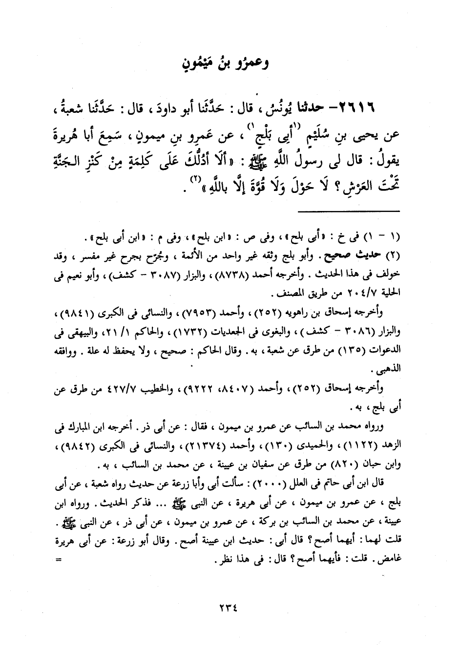 2616 - حَدَّثَنَا يُونُسُ قَالَ: حَدَّثَنَا أَبُو دَاوُدَ قَالَ: حَدَّثَنَا شُعْبَةُ، عَنْ يَحْيَى بْنِ سُلَيْمٍ أَبِي بَلْجٍ، عَنْ عَمْرِو بْنِ مَيْمُونٍ، سَمِعَ أَبَا هُرَيْرَةَ، يَقُولُ: قَالَ لِي رَسُولُ اللَّهِ صَلَّى اللهُ عَلَيْهِ وَسَلَّمَ: «أَلَا أَدُلُّكَ عَلَى كَلِمَةٍ مِنْ §كَنْزِ الْجَنَّةِ تَحْتَ الْعَرْشِ؟ لَا حَوْلَ وَلَا قُوَّةَ إِلَّا بِاللَّهِ»