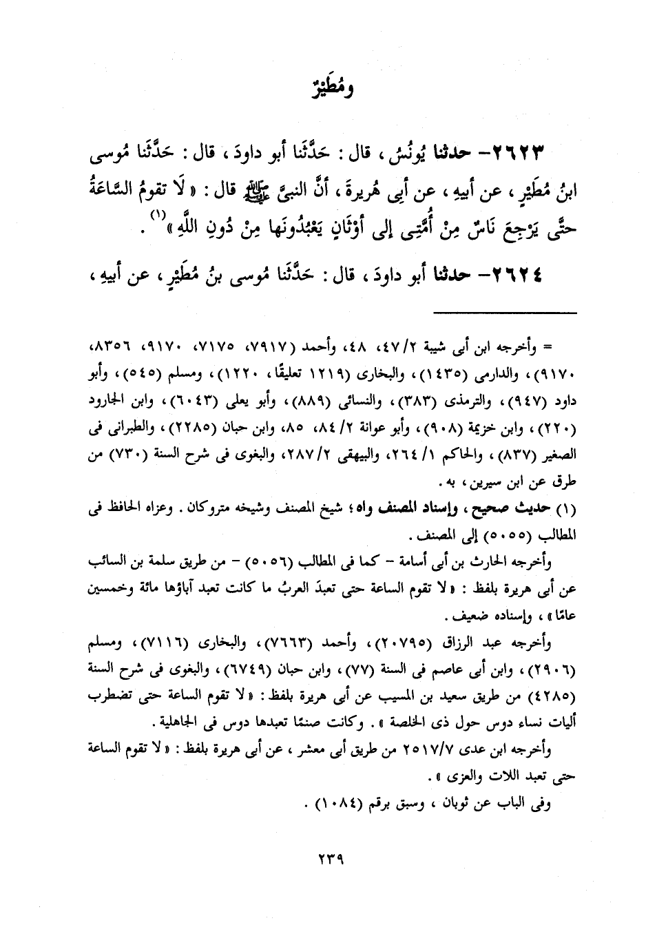 2623 - حَدَّثَنَا يُونُسُ قَالَ: حَدَّثَنَا أَبُو دَاوُدَ قَالَ: حَدَّثَنَا مُوسَى بْنُ مُطَيْرٍ، عَنْ أَبِيهِ، عَنْ أَبِي هُرَيْرَةَ، أَنَّ النَّبِيَّ صَلَّى اللهُ عَلَيْهِ وَسَلَّمَ قَالَ: «§لَا تَقُومُ السَّاعَةُ حَتَّى يَرْجِعَ نَاسٌ مِنَ أُمَّتِي إِلَى أَوْثَانٍ يَعْبُدُونَهَا مِنْ دُونِ اللَّهِ»
