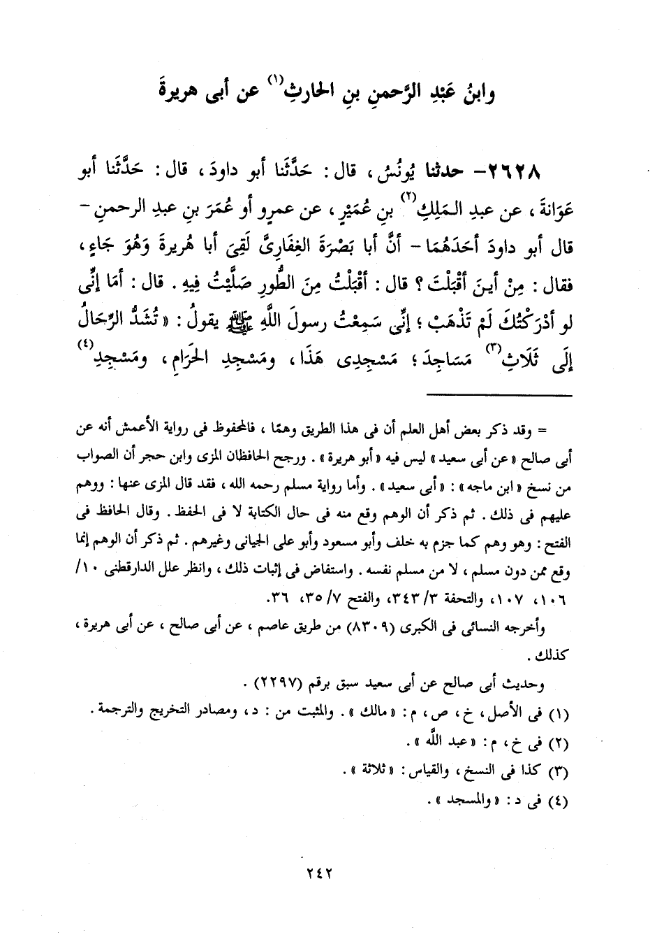 2628 - حَدَّثَنَا يُونُسُ قَالَ: حَدَّثَنَا أَبُو دَاوُدَ قَالَ: حَدَّثَنَا أَبُو عَوَانَةَ، عَنْ عَبْدِ الْمَلِكِ بْنِ عُمَيْرٍ، عَنْ عَمْرٍو أَوْ عُمَرَ بْنِ عَبْدِ الرَّحْمَنِ، قَالَ أَبُو دَاوُدَ أَحَدُهُمَا أَنَّ أَبَا بَصْرَةَ الْغِفَارِيَّ، لَقِيَ أَبَا هُرَيْرَةَ وَهُوَ جَاءٍ فَقَالَ: مِنْ أَيْنَ أَقْبَلْتَ؟، قَالَ: أَقْبَلْتُ مِنَ الطُّورِ صَلَّيْتُ فِيهِ قَالَ: أَمَا إِنِّي لَوْ أَدْرَكْتُكَ لَمْ تَذْهَبْ، إِنِّي سَمِعْتُ رَسُولَ اللَّهِ صَلَّى اللهُ عَلَيْهِ وَسَلَّمَ يَقُولُ: " §تُشَدُّ الرِّحَالُ إِلَى ثَلَاثَةِ مَسَاجِدَ: مَسْجِدِي هَذَا، وَمَسْجِدِ الْحَرَامِ، وَمَسْجِدِ -[243]- الْأَقْصَى "