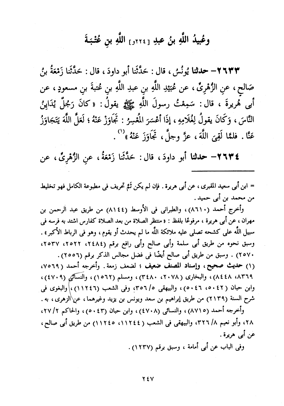 2633 - حَدَّثَنَا يُونُسُ قَالَ: حَدَّثَنَا أَبُو دَاوُدَ قَالَ: حَدَّثَنَا زَمْعَةُ بْنُ صَالِحٍ، عَنِ الزُّهْرِيِّ، عَنْ عُبَيْدِ اللَّهِ بْنِ عَبْدِ اللَّهِ بْنِ عُتْبَةَ بْنِ مَسْعُودٍ، عَنْ أَبِي هُرَيْرَةَ، قَالَ: سَمِعْتُ رَسُولَ اللَّهِ صَلَّى اللهُ عَلَيْهِ وَسَلَّمَ يَقُولُ: " كَانَ رَجُلٌ يُدَايِنُ النَّاسَ، وَكَانَ يَقُولُ لِغُلَامِهِ §إِذَا أَعْسَرَ الْمُعْسِرُ: تَجَاوَزْ عَنْهُ، لَعَلَّ اللَّهَ يَتَجَاوَزُ عَنَّا فَلَمَّا لَقِيَ اللَّهَ عَزَّ وَجَلَّ تَجَاوَزَ عَنْهُ "