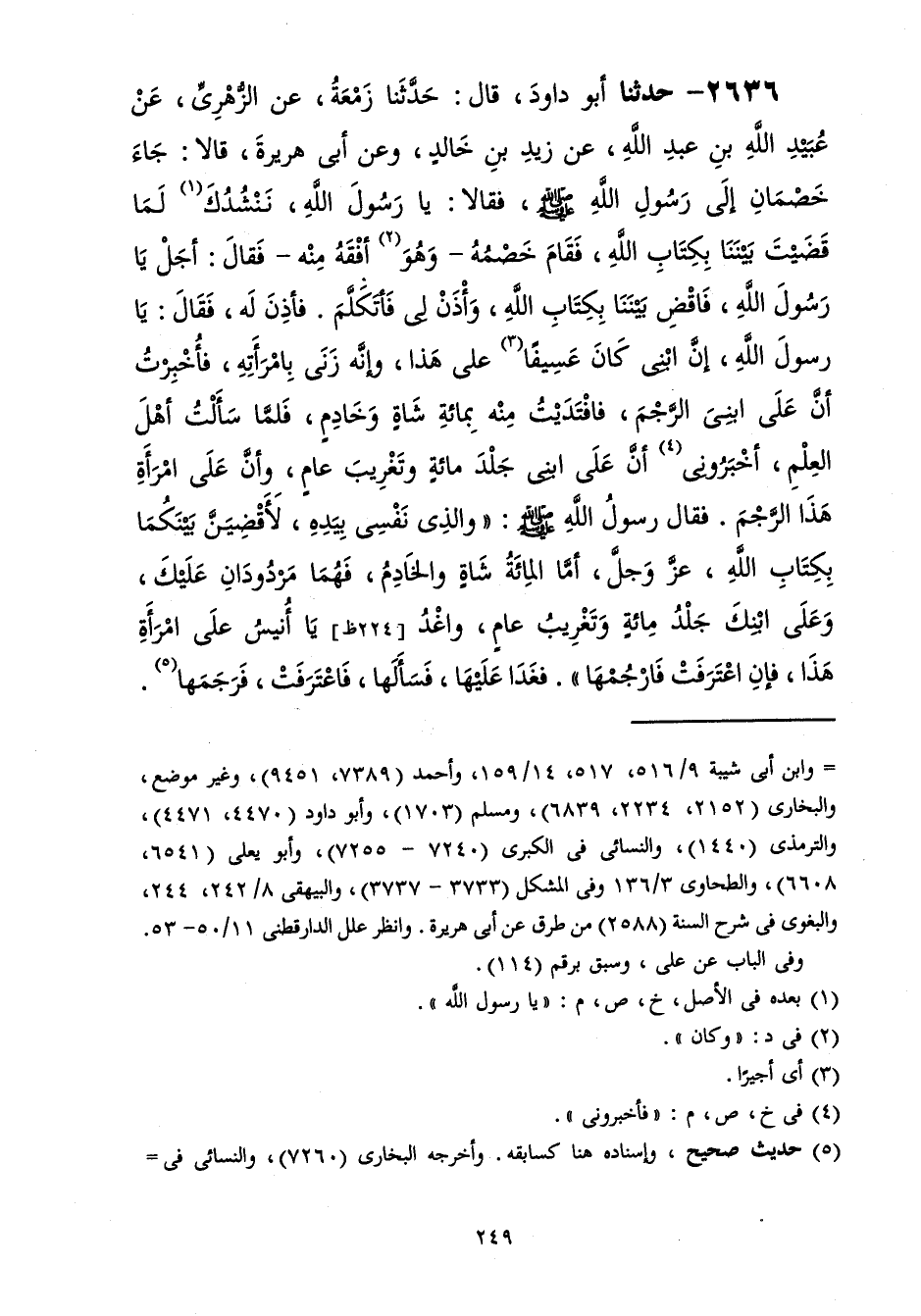 2636 - حَدَّثَنَا أَبُو دَاوُدَ قَالَ: حَدَّثَنَا زَمْعَةُ، عَنِ الزُّهْرِيِّ، عَنْ عُبَيْدِ اللَّهِ بْنِ عَبْدِ اللَّهِ، عَنْ زَيْدِ بْنِ خَالِدٍ، وَعَنْ أَبِي هُرَيْرَةَ، قَالَا: جَاءَ خَصْمَانِ إِلَى رَسُولِ اللَّهِ صَلَّى اللهُ عَلَيْهِ وَسَلَّمَ فَقَالَا: يَا رَسُولَ اللَّهِ، نَنْشُدُكَ لَمَا قَضَيْتَ بَيْنَنَا بِكِتَابِ اللَّهِ، فَقَامَ خَصْمُهُ وَهُوَ أَفْقَهُ مِنْهُ فَقَالَ: أَجَلْ يَا رَسُولَ اللَّهِ، فَاقْضِ بَيْنَنَا بِكِتَابِ اللَّهِ، وَائْذَنْ لِي فَأَتَكَلَّمَ فَأَذِنَ لَهُ فَقَالَ: يَا رَسُولَ اللَّهِ، إِنَّ ابْنِي كَانَ عَسِيفًا عَلَى هَذَا، وَإِنَّهُ زَنَى بِامْرَأَتِهِ، فَأُخْبِرْتُ أَنَّ عَلَى ابْنِيَ الرَّجْمَ، فَافْتَدَيْتُ مِنْهُ بِمِائَةِ شَاةٍ وَخَادِمٍ، فَلَمَّا سَأَلْتُ أَهْلَ الْعِلْمِ أَخْبَرُونِي أَنَّ عَلَى ابْنِي جَلْدَ مِائَةٍ وَتَغْرِيبَ عَامٍ، وَأَنَّ عَلَى امْرَأَةِ هَذَا الرَّجْمَ، فَقَالَ رَسُولُ اللَّهِ صَلَّى اللهُ عَلَيْهِ وَسَلَّمَ: «وَالَّذِي نَفْسِي بِيَدِهِ، لَأَقْضِيَنَّ بَيْنَكُمَا بِكِتَابِ اللَّهِ عَزَّ وَجَلَّ، أَمَّا الْمِائَةُ شَاةٍ وَالْخَادِمُ فَهُمَا مَرْدُودَانِ عَلَيْكَ، §وَعَلَى ابْنِكَ جَلْدُ مِائَةٍ وَتَغْرِيبُ عَامٍ، وَاغْدُ يَا أُنَيْسُ عَلَى امْرَأَةِ هَذَا، فَإِنِ اعْتَرَفَتْ فَارْجُمْهَا» فَغَدَا عَلَيْهَا، فَسَأَلَهَا، فَاعْتَرَفَتْ، فَرَجَمَهَا