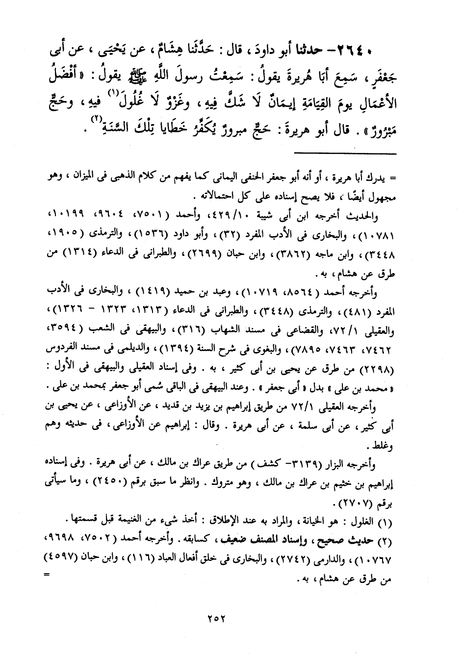 2640 - حَدَّثَنَا أَبُو دَاوُدَ قَالَ: حَدَّثَنَا هِشَامٌ، عَنْ يَحْيَى، عَنْ أَبِي جَعْفَرٍ، سَمِعَ أَبَا هُرَيْرَةَ، يَقُولُ: سَمِعْتُ رَسُولَ اللَّهِ صَلَّى اللهُ عَلَيْهِ وَسَلَّمَ يَقُولُ: «§أَفْضَلُ الْأَعْمَالِ يَوْمَ الْقِيَامَةِ إِيمَانٌ لَا شَكَّ فِيهِ، وَغَزْوٌ لَا غُلُولَ فِيهِ، وَحَجٌّ مَبْرُورٌ» قَالَ أَبُو هُرَيْرَةَ: حَجٌّ مَبْرُورٌ يُكَفِّرُ خَطَايَا تِلْكَ السَّنَةِ