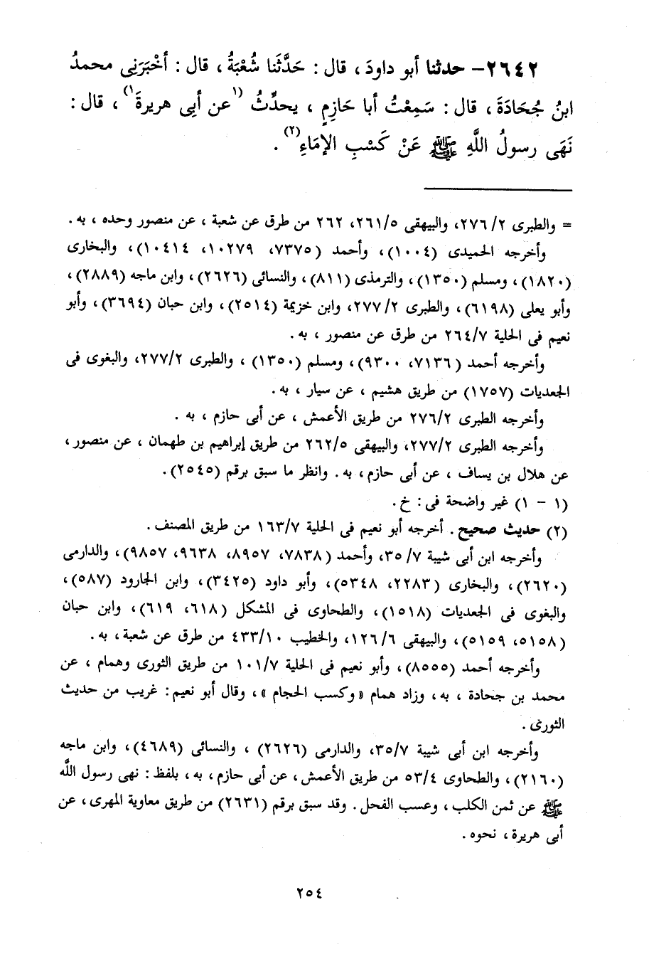 2642 - حَدَّثَنَا أَبُو دَاوُدَ قَالَ: حَدَّثَنَا شُعْبَةُ، قَالَ: أَخْبَرَنِي مُحَمَّدُ بْنُ جُحَادَةَ، قَالَ: سَمِعْتُ أَبَا حَازِمٍ، يُحَدِّثُ عَنْ أَبِي هُرَيْرَةَ، قَالَ: «§نَهَى رَسُولُ اللَّهِ صَلَّى اللهُ عَلَيْهِ وَسَلَّمَ عَنْ كَسْبِ الْإِمَاءِ»