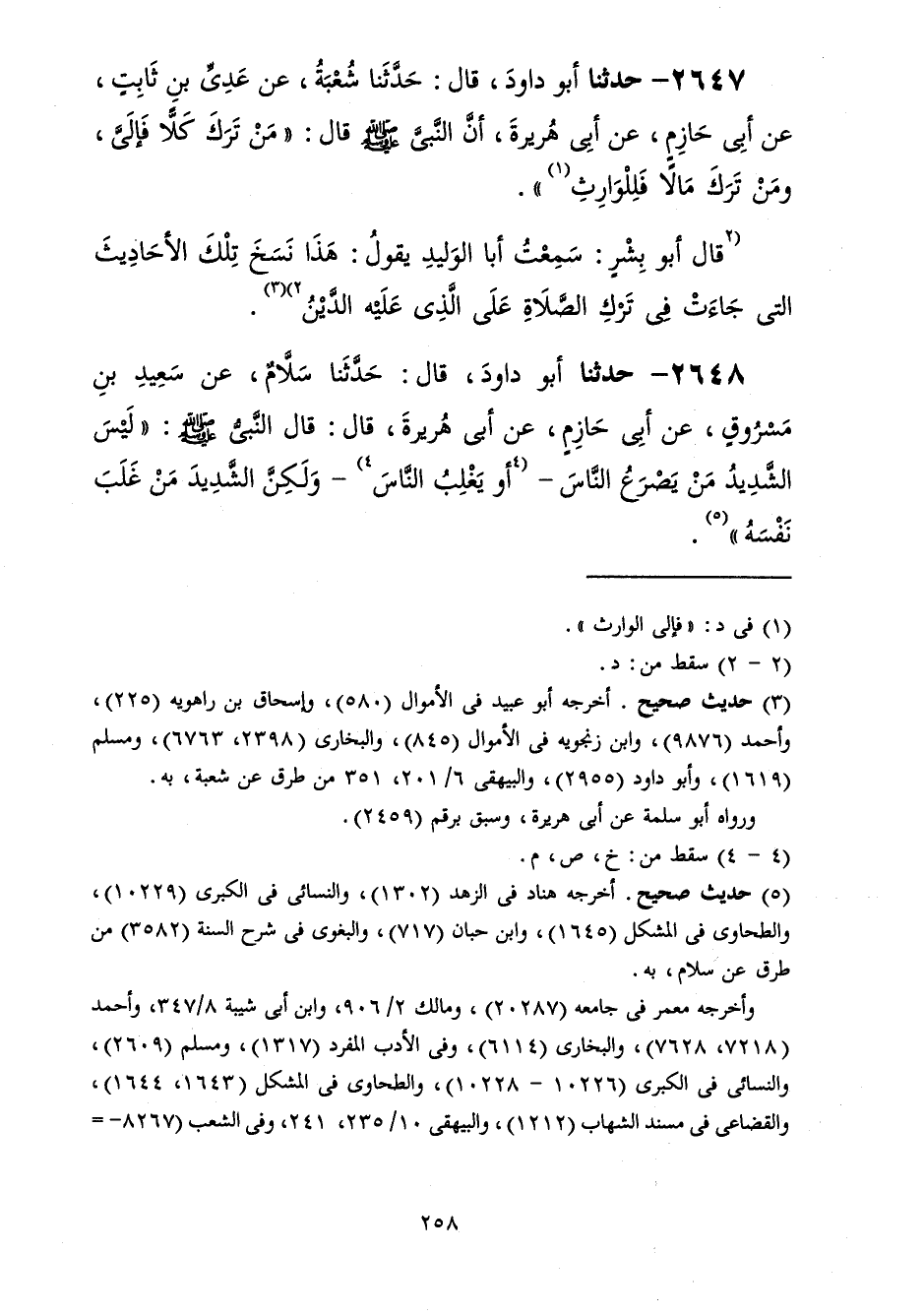 2648 - حَدَّثَنَا أَبُو دَاوُدَ قَالَ: حَدَّثَنَا سَلَّامٌ، عَنْ سَعِيدِ بْنِ مَسْرُوقٍ، عَنْ أَبِي حَازِمٍ، عَنْ أَبِي هُرَيْرَةَ، قَالَ: قَالَ النَّبِيُّ صَلَّى اللهُ عَلَيْهِ وَسَلَّمَ: «§لَيْسَ الشَّدِيدُ مَنْ يَصْرَعُ النَّاسَ، أَوْ يَغْلِبَ النَّاسَ، وَلَكِنَّ الشَّدِيدَ مَنْ غَلَبَ نَفْسَهُ»