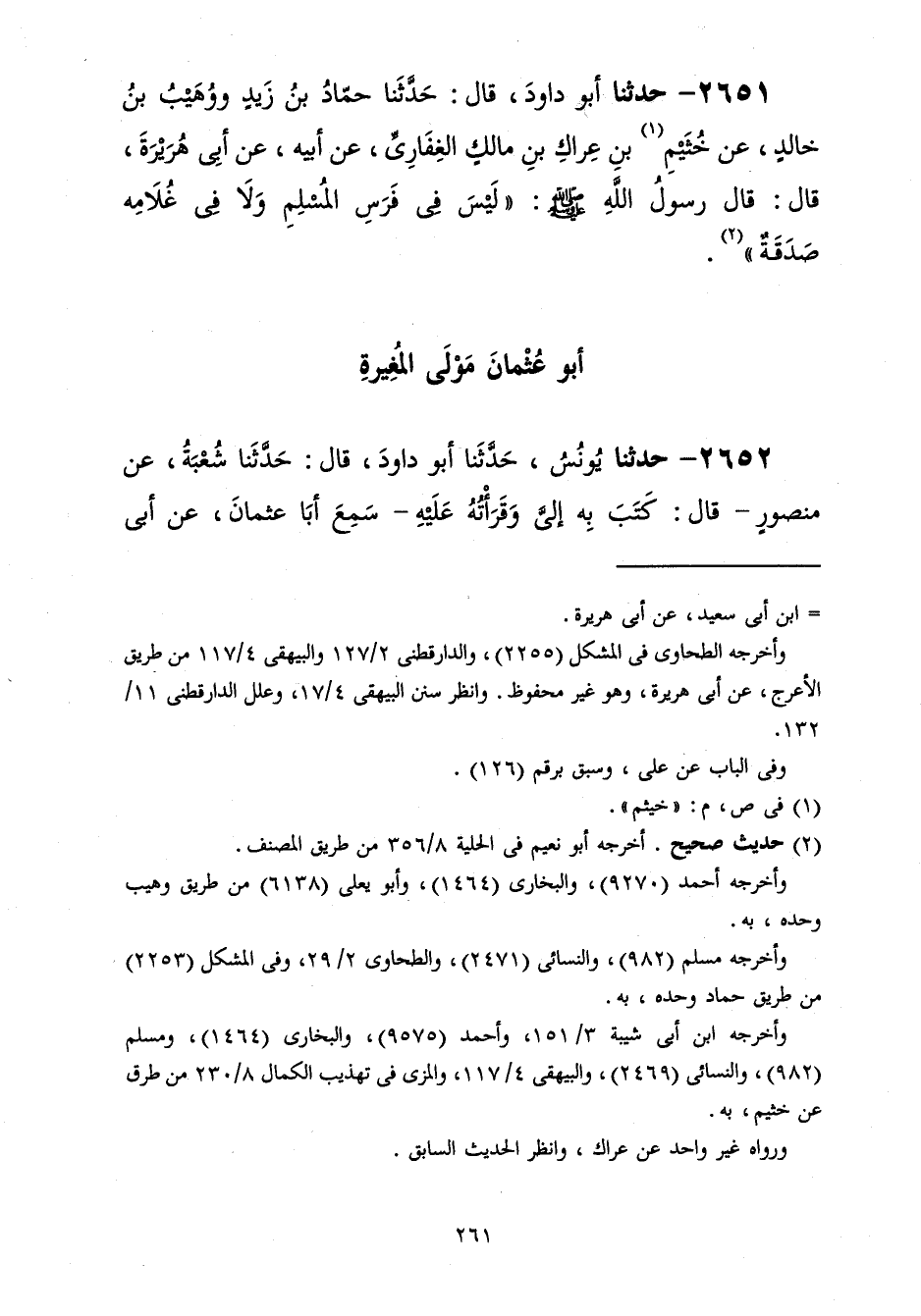 2651- حَدَّثَنَا حَمَّادُ بْنُ زَيْدٍ، وَوُهَيْبُ بْنُ خَالِدٍ، عَنْ خُثَيْمِ بْنِ عِرَاكِ بْنِ مَالِكٍ الْغِفَارِيِّ، عَنْ أَبِيهِ، عَنْ أَبِي هُرَيْرَةَ، قَالَ: قَالَ رَسُولُ اللهِ صَلَّى الله عَلَيْهِ وَسَلَّمَ: لَيْسَ فِي فَرَسِ الْمُسْلِمِ وَلاَ فِي غُلاَمِهِ صَدَقَةٌ.