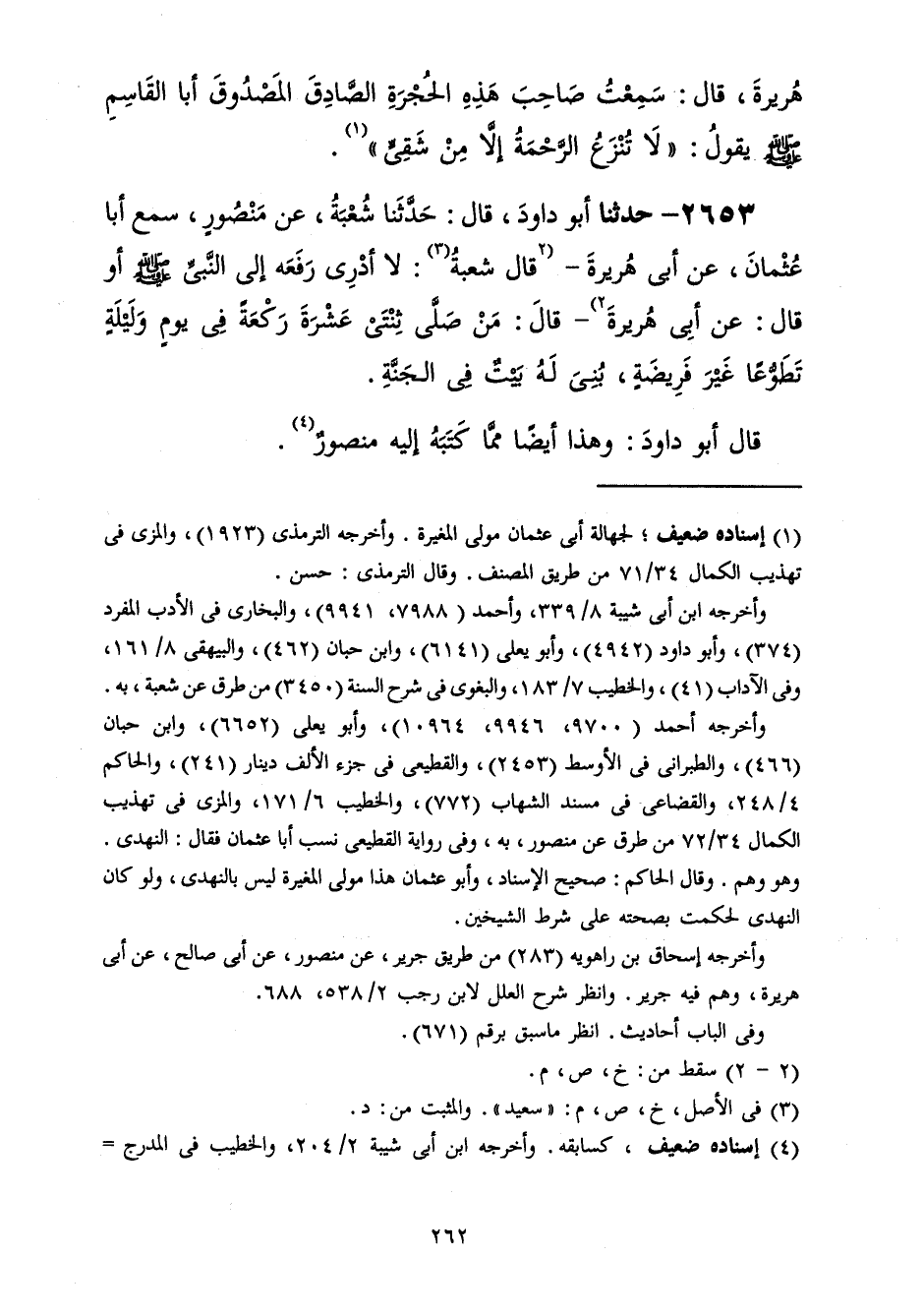 2653 - حَدَّثَنَا أَبُو دَاوُدَ قَالَ: حَدَّثَنَا شُعْبَةُ، عَنْ مَنْصُورٍ، سَمِعَ أَبَا عُثْمَانَ عَنْ أَبِي هُرَيْرَةَ، قَالَ شُعْبَةُ: لَا أَدْرِي رَفَعَهُ إِلَى النَّبِيِّ صَلَّى اللهُ عَلَيْهِ وَسَلَّمَ، أَوْ قَالَ: عَنْ أَبِي هُرَيْرَةَ قَالَ: «§مَنْ صَلَّى ثِنْتَيْ عَشْرَةَ رَكْعَةً فِي يَوْمٍ وَلَيْلَةٍ تَطَوُّعًا غَيْرَ فَرِيضَةٍ، بُنِيَ لَهُ بَيْتٌ فِي الْجَنَّةِ» قَالَ أَبُو دَاوُدَ: وَهَذَا أَيْضًا مِمَّا كَتَبَهُ إِلَيْهِ مَنْصُورٌ