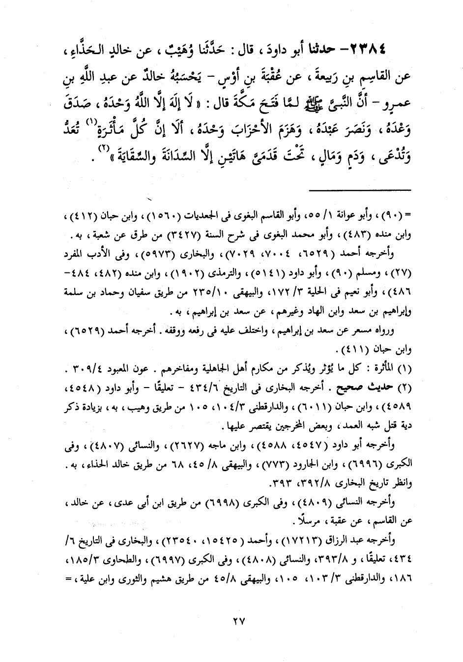 2384 - حَدَّثَنَا أَبُو دَاوُدَ قَالَ: حَدَّثَنَا وُهَيْبٌ، عَنْ خَالِدٍ الْحَذَّاءِ، عَنِ الْقَاسِمِ بْنِ رَبِيعَةَ، عَنْ عُقْبَةَ بْنِ أَوْسٍ، يَحْسَبُهُ خَالِدٌ، عَنْ عَبْدِ اللَّهِ بْنِ عَمْرٍو، أَنَّ النَّبِيَّ صَلَّى اللهُ عَلَيْهِ وَسَلَّمَ §لَمَّا فَتَحَ مَكَّةَ قَالَ: «لَا إِلَهَ إِلَّا اللَّهُ وَحْدَهُ، صَدَقَ وَعْدَهُ، وَنَصَرَ عَبْدَهُ، وَهَزَمَ الْأَحْزَابَ وَحْدَهُ، أَلَا إِنَّ كُلَّ مَأَثَرَةٍ تُعَدُّ وَتُدْعَى وَدَمٍ وَمَالٍ تَحْتَ قَدَمَيَّ هَاتَيْنِ إِلَّا السِّدَانَةَ وَالسِّقَايَةَ»