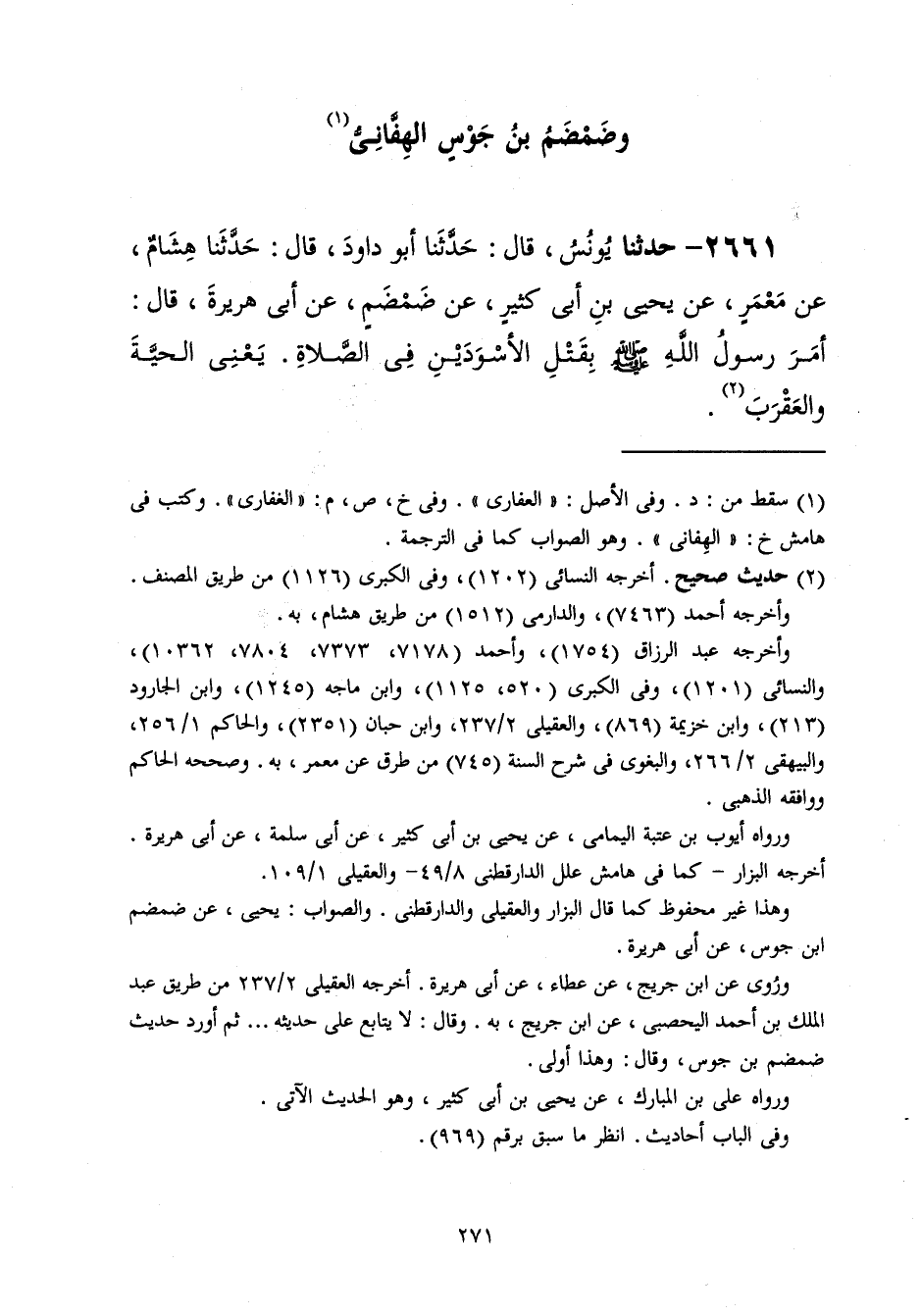 2661 - حَدَّثَنَا يُونُسُ قَالَ: حَدَّثَنَا أَبُو دَاوُدَ قَالَ: حَدَّثَنَا هِشَامٌ، عَنْ مَعْمَرٍ، عَنْ يَحْيَى بْنِ أَبِي كَثِيرٍ، عَنْ ضَمْضَمٍ، عَنْ أَبِي هُرَيْرَةَ، قَالَ: «§أَمَرَ رَسُولُ اللَّهِ صَلَّى اللهُ عَلَيْهِ وَسَلَّمَ بِقَتْلِ الْأَسْوَدَيْنِ فِي الصَّلَاةِ يَعْنِي الْحَيَّةَ وَالْعَقْرَبَ»