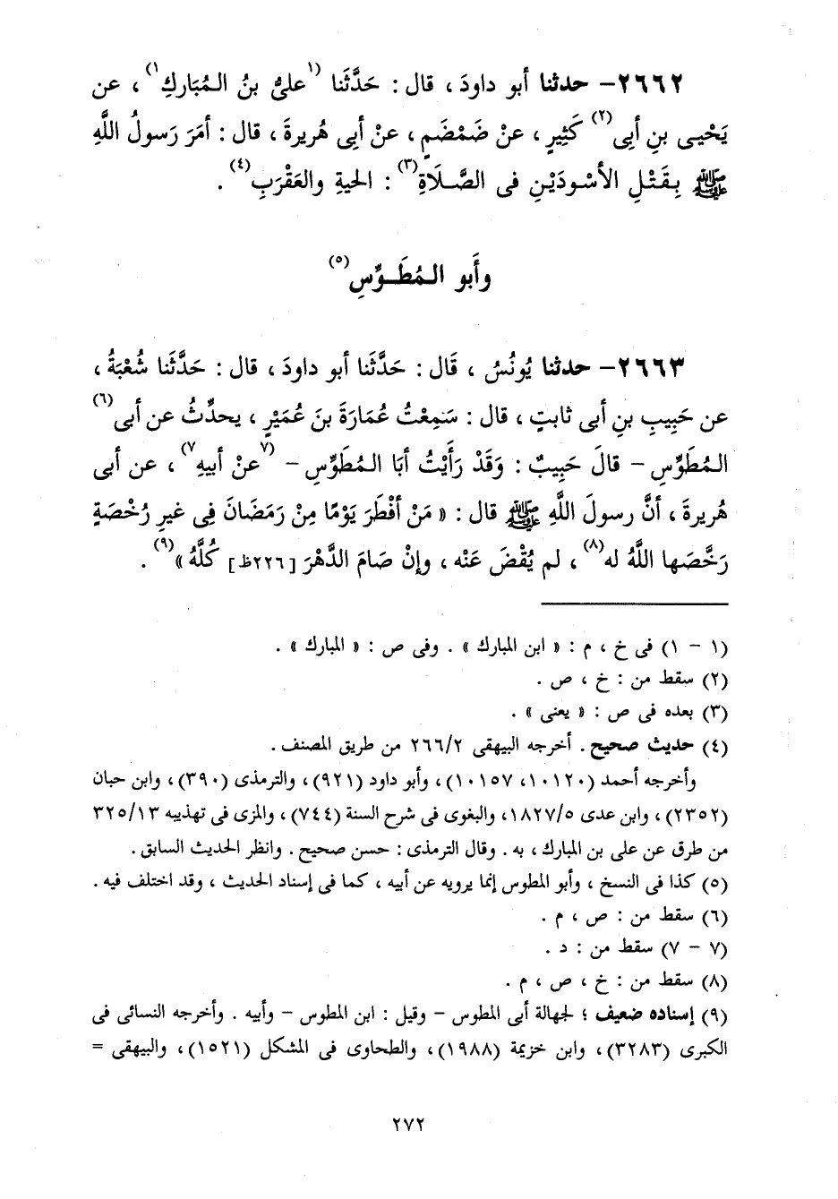 2662 - حَدَّثَنَا أَبُو دَاوُدَ قَالَ: حَدَّثَنَا عَلِيُّ بْنُ الْمُبَارَكِ، عَنْ يَحْيَى بْنِ أَبِي كَثِيرٍ، عَنْ ضَمْضَمٍ، عَنْ أَبِي هُرَيْرَةَ، قَالَ: " §أَمَرَ رَسُولُ اللَّهِ صَلَّى اللهُ عَلَيْهِ وَسَلَّمَ بِقَتْلِ الْأَسْوَدَيْنِ فِي الصَّلَاةِ: الْحَيَّةِ وَالْعَقْرَبِ "