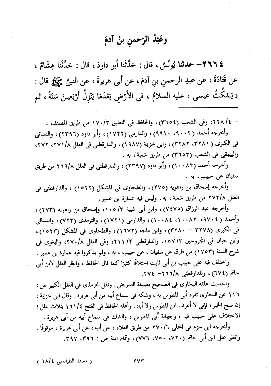 2664 - حَدَّثَنَا يُونُسُ قَالَ: حَدَّثَنَا أَبُو دَاوُدَ قَالَ: حَدَّثَنَا هِشَامٌ، عَنْ قَتَادَةَ، عَنْ عَبْدِ الرَّحْمَنِ بْنِ آدَمَ، عَنْ أَبِي هُرَيْرَةَ، عَنِ النَّبِيِّ صَلَّى اللهُ عَلَيْهِ وَسَلَّمَ قَالَ: «§يَمْكُثُ عِيسَى عَلَيْهِ السَّلَامُ فِي الْأَرْضِ بَعْدَمَا يَنْزِلُ أَرْبَعِينَ سَنَةً، ثُمَّ -[274]- يَمُوتُ وَيُصَلِّي عَلَيْهِ الْمُسْلِمُونَ وَيَدْفِنُونَهُ»