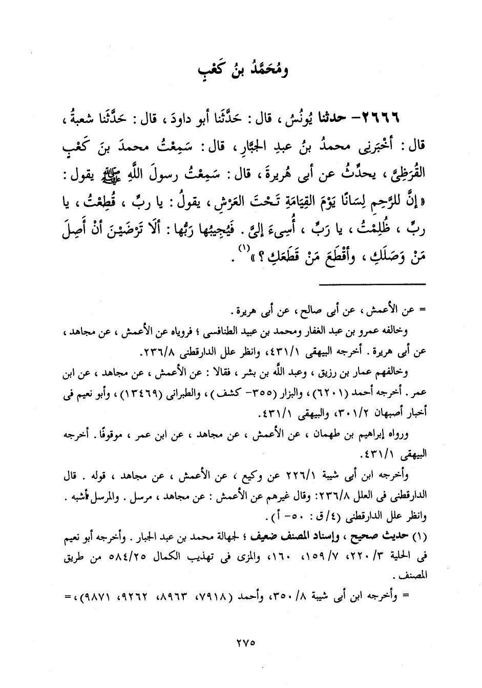2666 - حَدَّثَنَا يُونُسُ قَالَ: حَدَّثَنَا أَبُو دَاوُدَ قَالَ: حَدَّثَنَا شُعْبَةُ، قَالَ: أَخْبَرَنِي مُحَمَّدُ بْنُ عَبْدِ الْجَبَّارِ، قَالَ: سَمِعْتُ مُحَمَّدَ بْنَ كَعْبٍ الْقُرَظِيَّ، يُحَدِّثُ عَنْ أَبِي هُرَيْرَةَ، قَالَ: سَمِعْتُ رَسُولَ اللَّهِ صَلَّى اللهُ عَلَيْهِ وَسَلَّمَ يَقُولُ: إِنَّ §لِلرَّحِمِ لِسَانًا يَوْمَ الْقِيَامَةِ تَحْتَ الْعَرْشِ يَقُولُ: يَا رَبِّ، قُطِعْتُ، يَا رَبِّ، ظُلِمْتُ، يَا رَبِّ، أُسِيءَ إِلَيَّ فَيُجِيبُهَا رَبُّهَا: «أَلَا تَرْضَيْنَ أَنْ أَصِلَ مَنْ وَصَلَكِ، وَأَقْطَعَ مَنْ قَطَعَكِ؟»