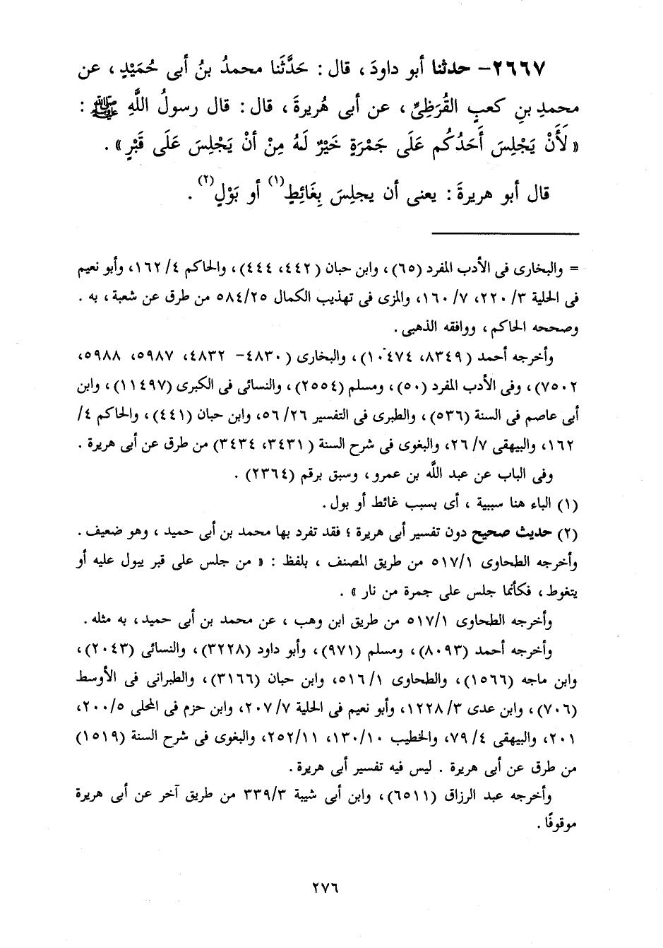2667 - حَدَّثَنَا أَبُو دَاوُدَ قَالَ: حَدَّثَنَا مُحَمَّدُ بْنُ أَبِي حُمَيْدٍ، عَنْ مُحَمَّدِ بْنِ كَعْبٍ الْقُرَظِيِّ، عَنْ أَبِي هُرَيْرَةَ، قَالَ: قَالَ رَسُولُ اللَّهِ صَلَّى اللهُ عَلَيْهِ وَسَلَّمَ: «§لَأَنْ يَجْلِسَ أَحَدُكُمْ عَلَى جَمْرَةٍ خَيْرٌ لَهُ مِنْ أَنْ يَجْلِسَ عَلَى قَبْرٍ» قَالَ أَبُو هُرَيْرَةَ: يَعْنِي: أَنْ يَجْلِسَ بِغَائِطٍ أَوْ بَوْلٍ