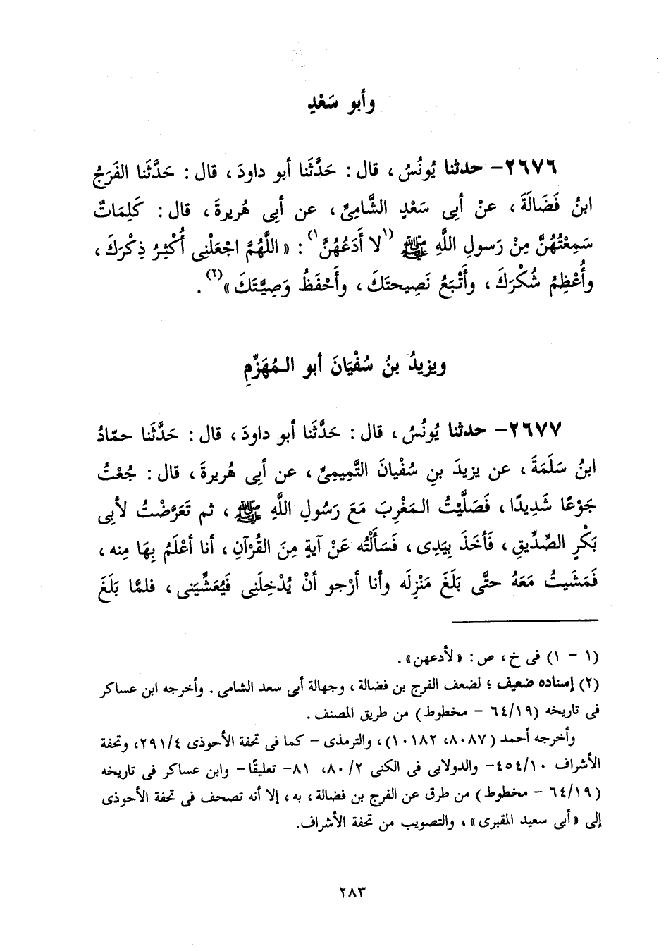 2676 - حَدَّثَنَا يُونُسُ قَالَ: حَدَّثَنَا أَبُو دَاوُدَ قَالَ: حَدَّثَنَا الْفَرَجُ بْنُ فَضَالَةَ، عَنْ أَبِي سَعْدٍ الشَّامِيِّ، عَنْ أَبِي هُرَيْرَةَ، قَالَ: كَلِمَاتٌ سَمِعْتُهُنَّ مِنْ رَسُولِ اللَّهِ صَلَّى اللهُ عَلَيْهِ وَسَلَّمَ لَا أَدَعُهُنَّ: «§اللَّهُمَّ اجْعَلْنِي أُكْثِرُ ذِكْرَكَ، وَأُعْظِمُ شُكْرَكَ، وَأَتْبَعُ نَصِيحَتَكَ، وَأَحْفَظُ وَصِيَّتَكَ»