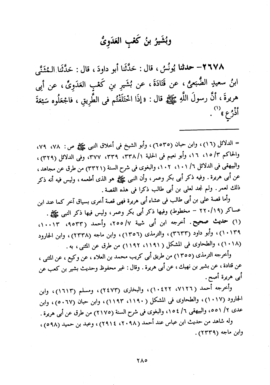 2678 - حَدَّثَنَا يُونُسُ قَالَ: حَدَّثَنَا أَبُو دَاوُدَ قَالَ: حَدَّثَنَا الْمُثَنَّى بْنُ سَعِيدٍ الضُّبَعِيُّ، عَنْ قَتَادَةَ، عَنْ بُشَيْرِ بْنِ كَعْبٍ الْعَدَوِيِّ، عَنْ أَبِي هُرَيْرَةَ، أَنَّ رَسُولَ اللَّهِ صَلَّى اللهُ عَلَيْهِ وَسَلَّمَ قَالَ: «§إِذَا اخْتَلَفْتُمْ فِي الطَّرِيقِ فَاجْعَلُوهُ سَبْعَةَ أَذْرُعٍ»