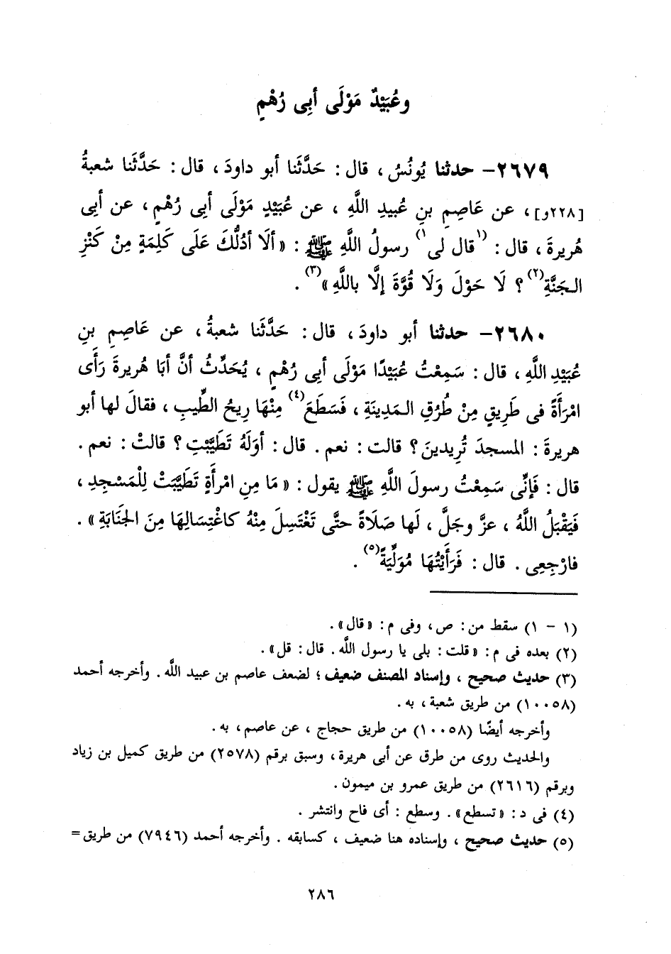 2680 - حَدَّثَنَا أَبُو دَاوُدَ قَالَ: حَدَّثَنَا شُعْبَةُ، عَنْ عَاصِمِ بْنِ عُبَيْدِ اللَّهِ، قَالَ: سَمِعْتُ عَبِيدًا، مَوْلَى أَبِي رُهْمٍ يُحَدِّثُ أَنَّ أَبَا هُرَيْرَةَ رَأَى امْرَأَةً فِي طَرِيقٍ مِنْ طُرُقِ الْمَدِينَةِ، فَسَطَعَ مِنْهَا رِيحُ الطِّيبِ، فَقَالَ لَهَا أَبُو هُرَيْرَةَ: الْمَسْجِدَ تُرِيدِينَ؟، قَالَتْ: نَعَمْ قَالَ: أَوَلَهُ تَطَيَّبْتِ؟، قَالَتْ: نَعَمْ قَالَ: فَإِنِّي سَمِعْتُ رَسُولَ اللَّهِ صَلَّى اللهُ عَلَيْهِ وَسَلَّمَ يَقُولُ: «§مَا مِنِ امْرَأَةٍ تَطَيَّبَتْ لِلْمَسْجِدِ فَيَقْبَلُ اللَّهُ عَزَّ وَجَلَّ لَهَا صَلَاةً حَتَّى تَغْتَسِلَ مِنْهُ كَاغْتِسَالِهَا مِنَ الْجَنَابَةِ» فَارْجِعِي قَالَ: فَرَأَيْتُهَا مُوَلِّيَةً