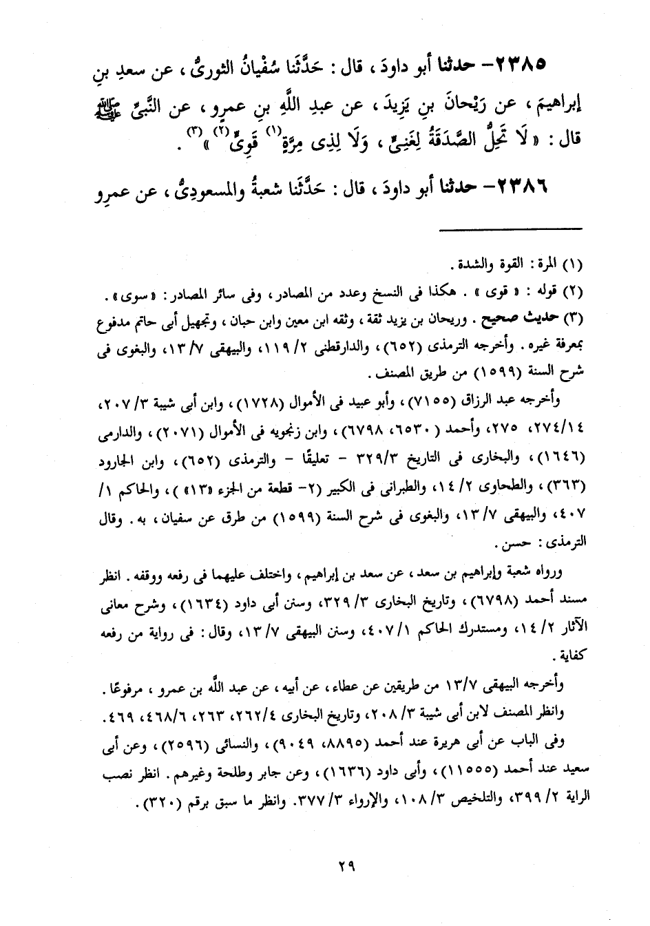 2385- حَدَّثَنَا سُفْيَانُ الثَّوْرِيُّ، عَنْ سَعْدِ بْنِ إِبْرَاهِيمَ، عَنْ رَيْحَانَ بْنِ يَزِيدَ، عَنْ عَبْدِ اللهِ بْنِ عَمْرٍو، عَنِ النَّبِيِّ صَلَّى الله عَلَيْهِ وَسَلَّمَ قَالَ: لاَ تَحِلُّ الصَّدَقَةُ لِغَنِيٍّ وَلاَ لِذِي مِرَّةٍ قَوِيٍّ.