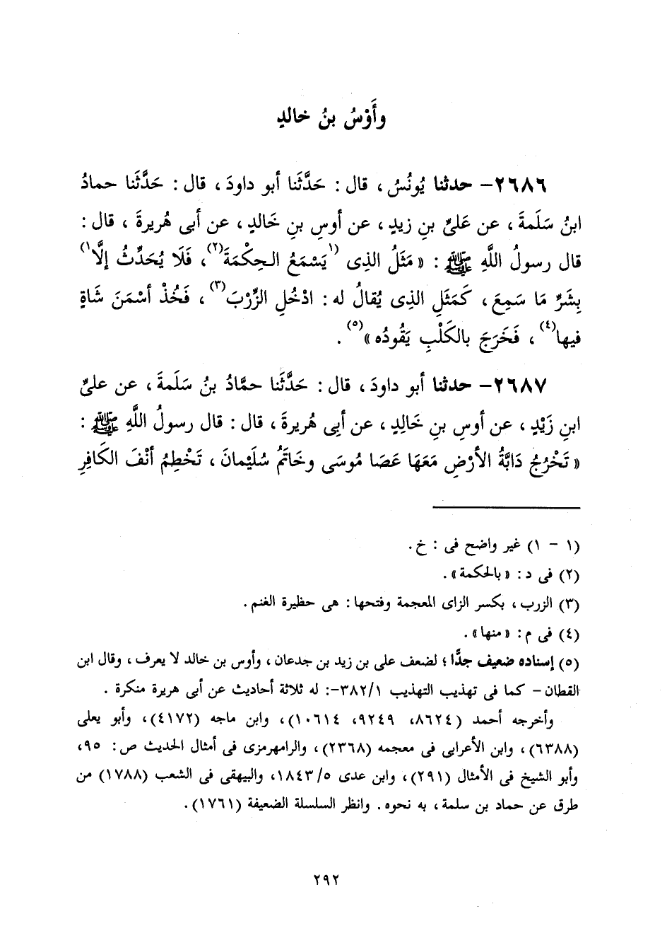 2687 - حَدَّثَنَا أَبُو دَاوُدَ قَالَ: حَدَّثَنَا حَمَّادُ بْنُ سَلَمَةَ، عَنْ عَلِيِّ بْنِ زَيْدٍ، عَنْ أَوْسِ بْنِ خَالِدٍ، عَنْ أَبِي هُرَيْرَةَ، قَالَ: قَالَ رَسُولُ اللَّهِ صَلَّى اللهُ عَلَيْهِ وَسَلَّمَ: «§تَخْرُجُ دَابَّةُ الْأَرْضِ مَعَهَا عَصَا مُوسَى، وَخَاتَمُ سُلَيْمَانَ، تَخْطِمُ أَنْفَ الْكَافِرِ -[293]- بِالْعَصَا، وَتُجْلِي وَجْهَ الْمُؤْمِنِ بِالْخَاتَمِ، حَتَّى يَجْتَمِعَ النَّاسُ عَلَى الْخِوَانِ، يُعْرَفُ الْمُؤْمِنُ مِنَ الْكَافِرِ»