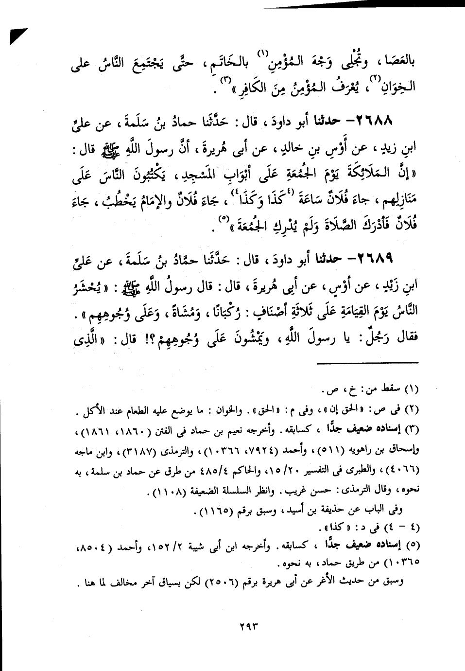 2688 - حَدَّثَنَا أَبُو دَاوُدَ قَالَ: حَدَّثَنَا حَمَّادُ بْنُ سَلَمَةَ، عَنْ عَلِيِّ بْنِ زَيْدٍ، عَنْ أَوْسِ بْنِ خَالِدٍ، عَنْ أَبِي هُرَيْرَةَ، أَنَّ رَسُولَ اللَّهِ صَلَّى اللهُ عَلَيْهِ وَسَلَّمَ قَالَ: «إِنَّ §الْمَلَائِكَةَ يَوْمَ الْجُمُعَةِ عَلَى أَبْوَابِ الْمَسْجِدِ يَكْتُبُونَ النَّاسَ عَلَى مَنَازِلِهِمْ، جَاءَ فُلَانٌ سَاعَةَ كَذَا وَكَذَا، جَاءَ فُلَانٌ وَالْإِمَامُ يَخْطُبُ، جَاءَ فُلَانٌ فَأَدْرَكَ الصَّلَاةَ وَلَمْ يُدْرِكِ الْجُمُعَةَ»