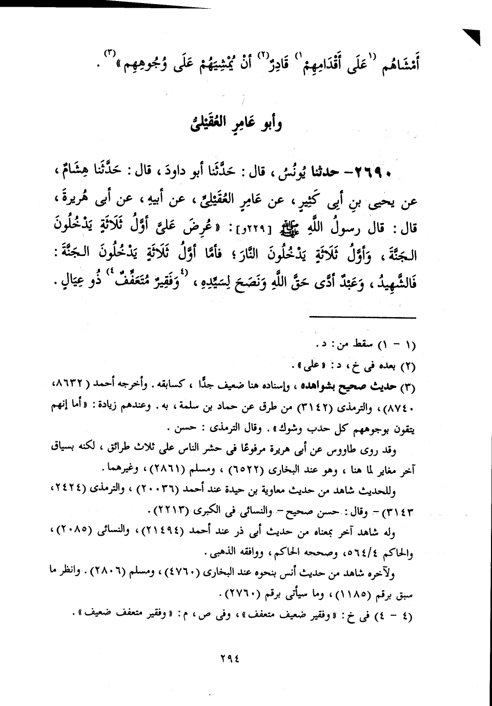 2690 - حَدَّثَنَا يُونُسُ قَالَ: حَدَّثَنَا أَبُو دَاوُدَ قَالَ: حَدَّثَنَا هِشَامٌ، عَنْ يَحْيَى بْنِ أَبِي كَثِيرٍ، عَنْ عَامِرٍ الْعُقَيْلِيِّ، عَنْ أَبِيهِ، عَنْ أَبِي هُرَيْرَةَ، قَالَ: قَالَ رَسُولُ اللَّهِ صَلَّى اللهُ عَلَيْهِ وَسَلَّمَ: «§عُرِضَ عَلَيَّ أَوَّلُ ثَلَاثَةٍ يَدْخُلُونَ الْجَنَّةَ وَأَوَّلُ ثَلَاثَةٍ يَدْخُلُونَ النَّارَ فَأَمَّا أَوَّلُ ثَلَاثَةٍ يَدْخُلُونَ الْجَنَّةَ فَالشَّهِيدُ، وَعَبْدٌ أَدَّى حَقَّ اللَّهِ وَنَصَحَ لِسَيِّدِهِ، وَفَقِيرٌ مُتَعَفِّفٌ ذُو عِيَالٍ -[295]-، وَأَمَّا أَوَّلُ ثَلَاثَةٍ يَدْخُلُونَ النَّارَ فَسُلْطَانٌ مُسَلَّطٌ، وَذُو ثَرْوَةٍ مِنَ الْمَالِ لَمْ يُعْطِ حَقَّ مَالِهِ، وَفَقِيرٌ فَخُورٌ»