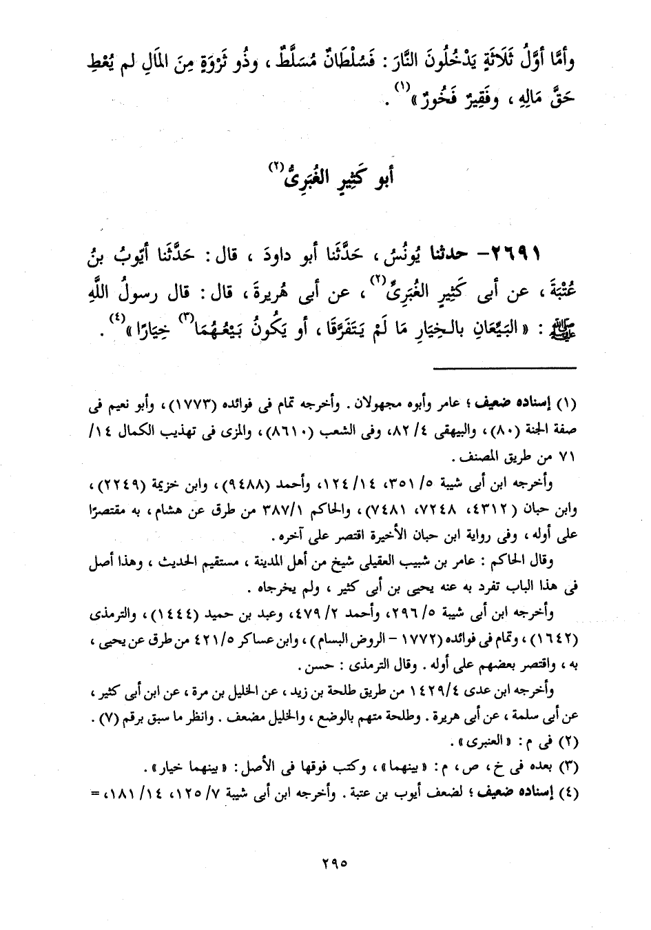 2691 - حَدَّثَنَا يُونُسُ، حَدَّثَنَا أَبُو دَاوُدَ قَالَ: حَدَّثَنَا أَيُّوبُ بْنُ عُتْبَةَ، عَنْ أَبِي كَثِيرٍ الْغُبَرِيِّ، عَنْ أَبِي هُرَيْرَةَ، قَالَ: قَالَ رَسُولُ اللَّهِ صَلَّى اللهُ عَلَيْهِ وَسَلَّمَ: «§الْبَيِّعَانِ بِالْخِيَارِ مَا لَمْ يَتَفَرَّقَا، أَوْ يَكُونُ بَيْعُهُمَا خِيَارًا»