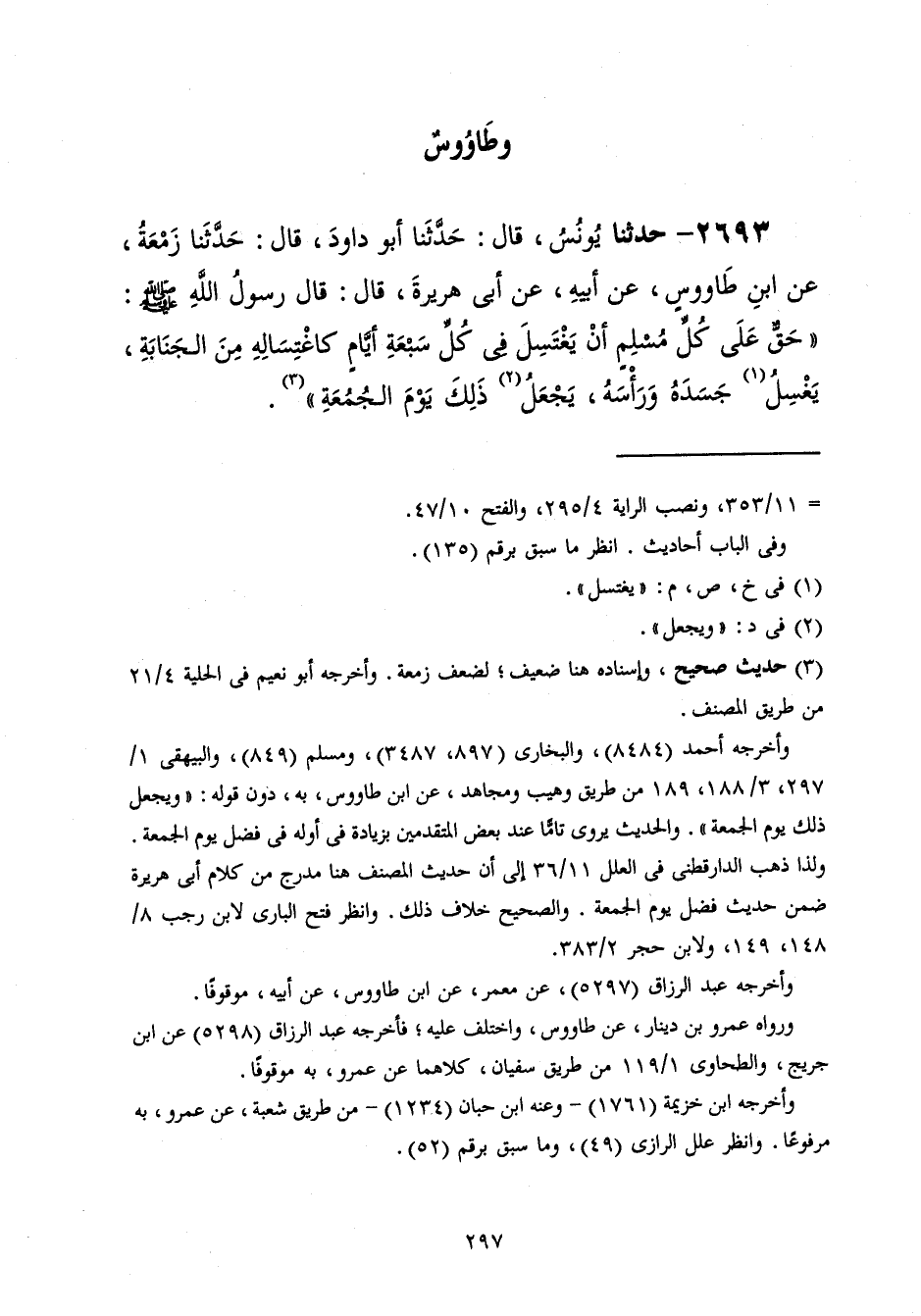 2693 - حَدَّثَنَا يُونُسُ قَالَ: حَدَّثَنَا أَبُو دَاوُدَ قَالَ: حَدَّثَنَا زَمْعَةُ، عَنِ ابْنِ طَاوُسٍ، عَنْ أَبِيهِ، عَنْ أَبِي هُرَيْرَةَ، قَالَ: قَالَ رَسُولُ اللَّهِ صَلَّى اللهُ عَلَيْهِ وَسَلَّمَ: «§حَقٌّ عَلَى كُلِّ مُسْلِمٍ أَنْ يَغْتَسِلَ فِي كُلِّ سَبْعَةِ أَيَّامٍ كَاغْتِسَالِهِ مِنَ الْجَنَابَةِ، يَغْسِلُ جَسَدَهُ وَرَأْسَهُ، يَجْعَلُ ذَلِكَ يَوْمَ الْجُمُعَةِ»