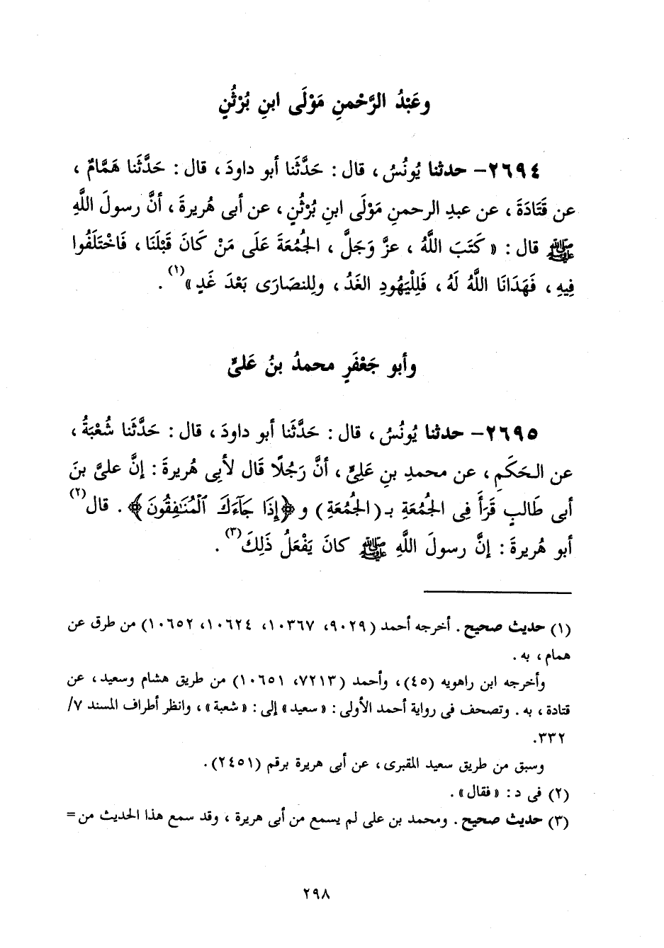 2694 - حَدَّثَنَا يُونُسُ قَالَ: حَدَّثَنَا أَبُو دَاوُدَ قَالَ: حَدَّثَنَا هَمَّامٌ، عَنْ قَتَادَةَ، عَنْ عَبْدِ الرَّحْمَنِ، مَوْلَى ابْنِ بُرْثُنٍ، عَنْ أَبِي هُرَيْرَةَ، أَنَّ رَسُولُ اللَّهِ صَلَّى اللهُ عَلَيْهِ وَسَلَّمَ قَالَ: «§كَتَبَ اللَّهُ عَزَّ وَجَلَّ الْجُمُعَةَ عَلَى مَنْ كَانَ قَبْلَنَا فَاخْتَلَفُوا فِيهِ، فَهَدَانَا اللَّهُ لَهُ، فَلِلْيَهُودِ الْغَدُ، وَلِلنَّصَارَى بَعْدَ غَدٍ»
