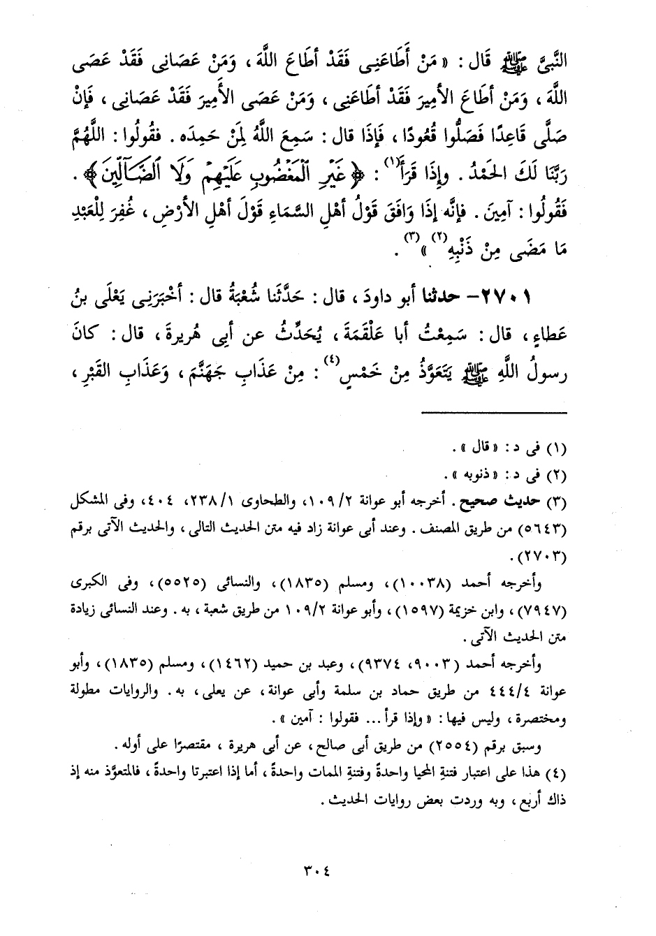 2701 - حَدَّثَنَا أَبُو دَاوُدَ قَالَ: حَدَّثَنَا شُعْبَةُ، قَالَ: أَخْبَرَنِي يَعْلَى بْنُ عَطَاءٍ، قَالَ: سَمِعْتُ أَبَا عَلْقَمَةَ يُحَدِّثُ عَنْ أَبِي هُرَيْرَةَ، قَالَ: " كَانَ رَسُولُ اللَّهِ صَلَّى اللهُ عَلَيْهِ وَسَلَّمَ §يَتَعَوَّذُ مِنْ خَمْسٍ: مِنْ عَذَابِ جَهَنَّمَ، وَعَذَابِ الْقَبْرِ -[305]-، وَفِتْنَةِ الْمَحْيَا وَالْمَمَاتِ، وَفِتْنَةِ الْمَسِيحِ الدَّجَّالِ "