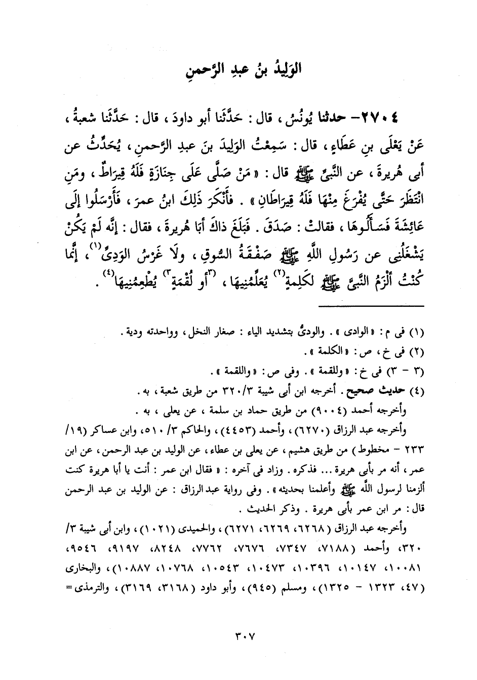 2704 - حَدَّثَنَا يُونُسُ قَالَ: حَدَّثَنَا أَبُو دَاوُدَ قَالَ: حَدَّثَنَا شُعْبَةُ، عَنْ يَعْلَى بْنِ عَطَاءٍ، قَالَ: سَمِعْتُ الْوَلِيدَ بْنَ عَبْدِ الرَّحْمَنِ يُحَدِّثُ عَنْ أَبِي هُرَيْرَةَ، عَنِ النَّبِيِّ صَلَّى اللهُ عَلَيْهِ وَسَلَّمَ قَالَ: «§مَنْ صَلَّى عَلَى جِنَازَةٍ فَلَهُ قِيرَاطٌ، وَمَنِ انْتَظَرَ حَتَّى يُفْرَغَ مِنْهَا فَلَهُ قِيرَاطَانِ» فَأَنْكَرَ ذَلِكَ ابْنُ عُمَرَ، فَأَرْسَلُوا إِلَى عَائِشَةَ فَسَأَلُوهَا فَقَالَتْ: صَدَقَ فَبَلَغَ ذَلِكَ أَبَا هُرَيْرَةَ فَقَالَ: إِنَّهُ لَمْ يَكُنْ يَشْغَلُنِي عَنْ رَسُولِ اللَّهِ صَلَّى اللهُ عَلَيْهِ وَسَلَّمَ صَفْقَةُ السُّوقِ وَلَا غَرْسُ الْوَدِيِّ، إِنَّمَا كُنْتُ أَلْزَمُ النَّبِيَّ صَلَّى اللهُ عَلَيْهِ وَسَلَّمَ لَكَلِمَةٍ يُعَلِّمُنِيهَا، أَوْ لُقْمَةٍ يُطْعِمُنِيهَا