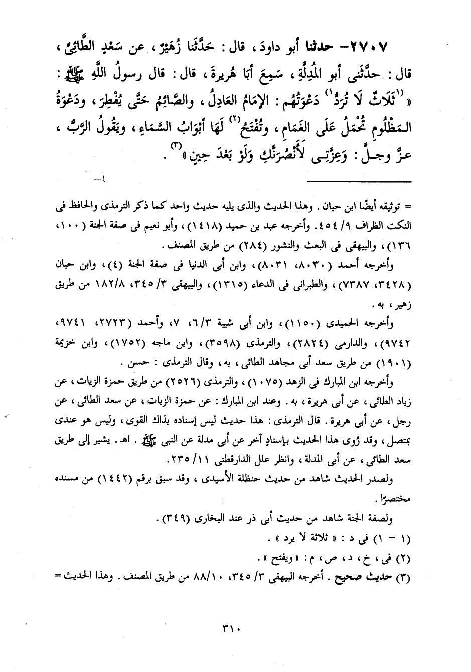 2707 - حَدَّثَنَا أَبُو دَاوُدَ قَالَ: حَدَّثَنَا زُهَيْرٌ، عَنْ سَعْدٍ الطَّائِيِّ، قَالَ: حَدَّثَنِي أَبُو الْمُدِلَّةِ، سَمِعَ أَبَا هُرَيْرَةَ قَالَ: قَالَ رَسُولُ اللَّهِ صَلَّى اللهُ عَلَيْهِ وَسَلَّمَ: " §ثَلَاثٌ لَا تُرَدُّ دَعْوَتُهُمُ: الْإِمَامُ الْعَادِلُ، وَالصَّائِمُ حَتَّى يُفْطِرَ، وَدَعْوَةُ الْمَظْلُومِ تُحْمَلُ عَلَى الْغَمَامِ، وَتُفْتَحُ لَهَا أَبْوَابُ السَّمَاءِ، وَيَقُولُ الرَّبُّ عَزَّ وَجَلَّ: وَعِزَّتِي، لَأَنْصُرَنَّكِ وَلَوْ بَعْدَ حِينٍ "