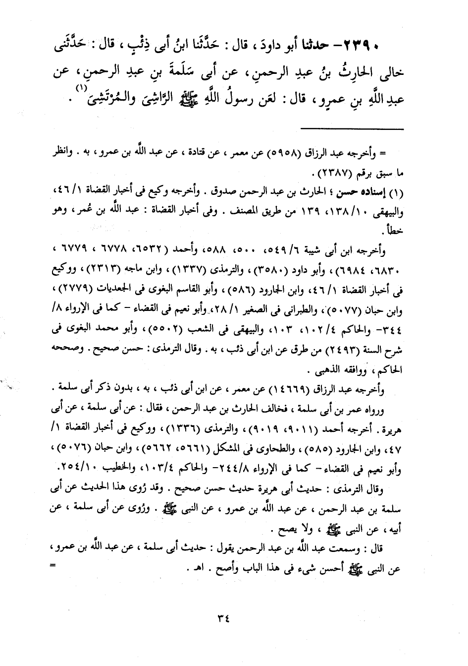 2390 - حَدَّثَنَا أَبُو دَاوُدَ قَالَ: حَدَّثَنَا ابْنُ أَبِي ذِئْبٍ، قَالَ: حَدَّثَنِي خَالِي الْحَارِثُ بْنُ عَبْدِ الرَّحْمَنِ، عَنْ أَبِي سَلَمَةَ بْنِ عَبْدِ الرَّحْمَنِ، عَنْ عَبْدِ اللَّهِ بْنِ عَمْرٍو، قَالَ: «§لَعَنَ رَسُولُ اللَّهِ صَلَّى اللهُ عَلَيْهِ وَسَلَّمَ الرَّاشِيَ وَالْمُرْتَشِيَ»