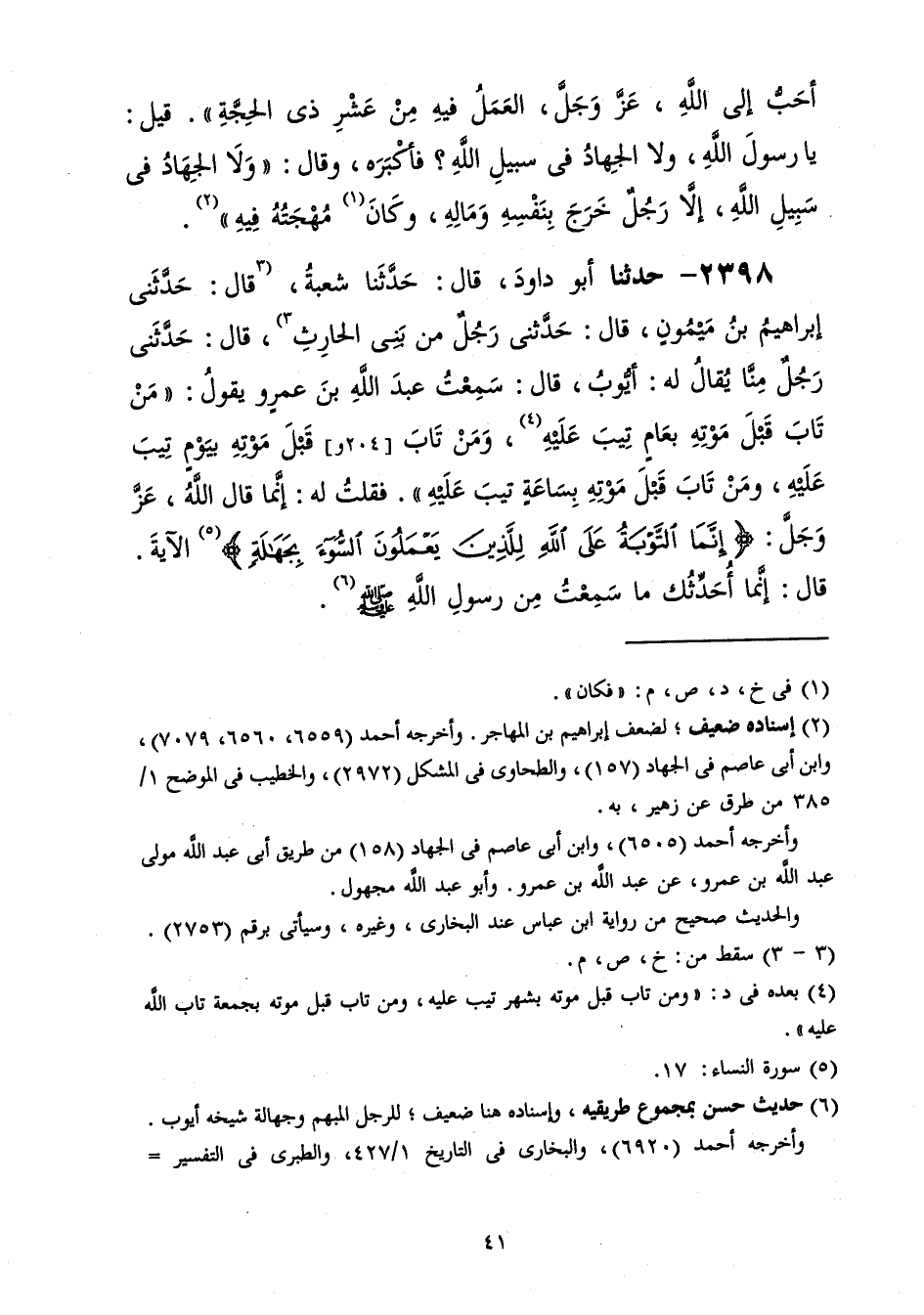 2398 - حَدَّثَنَا أَبُو دَاوُدَ قَالَ: حَدَّثَنَا شُعْبَةُ قَالَ: حَدَّثَنِي إِبْرَاهِيمُ بْنُ مَيْمُونٍ قَالَ: حَدَّثَنِي رَجُلٌ مِنْ بَنِي الْحَارِثِ، قَالَ: حَدَّثَنِي رَجُلٌ مِنَّا يُقَالُ لَهُ أَيُّوبُ قَالَ: سَمِعْتُ عَبْدَ اللَّهِ بْنَ عَمْرٍو، يَقُولُ: «§مَنْ تَابَ قَبْلَ مَوْتِهِ بِعَامٍ تِيبَ عَلَيْهِ، وَمَنْ تَابَ قَبْلَ مَوْتِهِ بِيَوْمٍ تِيبَ عَلَيْهِ، وَمَنْ تَابَ قَبْلَ مَوْتِهِ بِسَاعَةٍ تِيبَ عَلَيْهِ» فَقُلْتُ لَهُ: إِنَّمَا قَالَ اللَّهُ عَزَّ وَجَلَّ: {إِنَّمَا التَّوْبَةُ عَلَى اللَّهِ لِلَّذِينَ يَعْمَلُونَ السُّوءَ بِجَهَالَةٍ} [النساء: 17] الْآيَةَ قَالَ: إِنَّمَا أُحَدِّثُكَ مَا سَمِعْتُ مِنْ رَسُولِ اللَّهِ صَلَّى اللهُ عَلَيْهِ وَسَلَّمَ