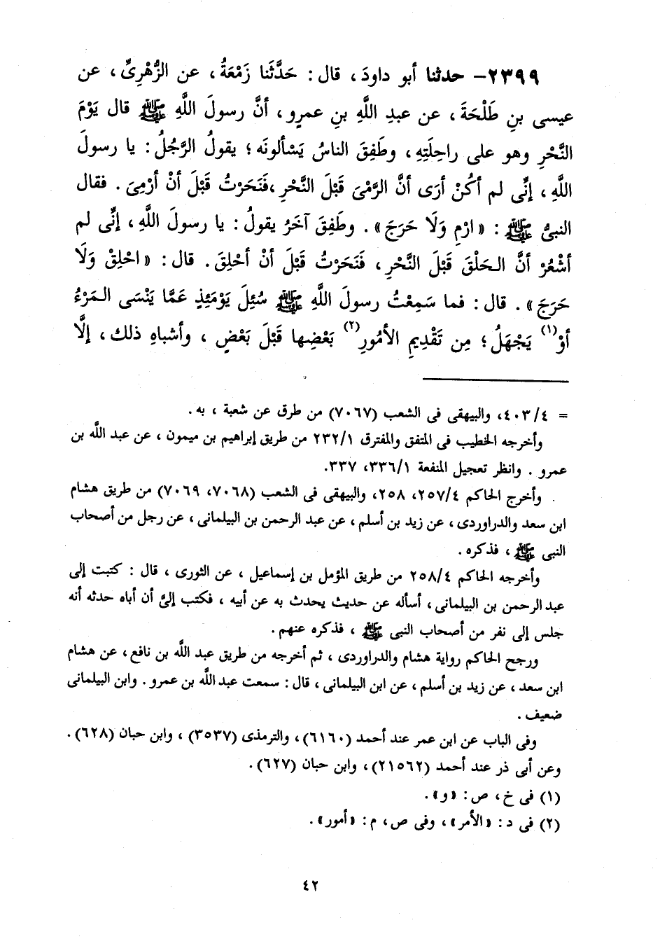 2399 - حَدَّثَنَا أَبُو دَاوُدَ قَالَ: حَدَّثَنَا زَمْعَةُ، عَنِ الزُّهْرِيِّ، عَنْ عِيسَى بْنِ طَلْحَةَ، عَنْ عَبْدِ اللَّهِ بْنِ عَمْرٍو، أَنَّ رَسُولَ اللَّهِ صَلَّى اللهُ عَلَيْهِ وَسَلَّمَ قَالَ يَوْمَ النَّحْرِ وَهُوَ عَلَى رَاحِلَتِهِ، وَطَفِقَ النَّاسُ يَسْأَلُونَهُ، يَقُولُ الرَّجُلُ: يَا رَسُولَ اللَّهِ، إِنِّي لَمْ أَكُنْ أَرَى أَنَّ الرَّمْيَ قَبْلَ النَّحْرِ فَنَحَرْتُ قَبْلَ أَنْ أَرْمِيَ، فَقَالَ النَّبِيُّ صَلَّى اللهُ عَلَيْهِ وَسَلَّمَ: «§ارْمِ وَلَا حَرَجَ» وَطَفِقَ آخَرُ يَقُولُ: يَا رَسُولَ اللَّهِ إِنِّي لَمْ أَشْعُرْ أَنَّ الْحَلْقَ قَبْلَ النَّحْرِ فَنَحَرْتُ قَبْلَ أَنْ أَحْلِقَ، فَقَالَ: «احْلِقْ وَلَا حَرَجَ» قَالَ: فَمَا سَمِعْتُ رَسُولَ اللَّهِ صَلَّى اللهُ عَلَيْهِ وَسَلَّمَ سُئِلَ يَوْمَئِذٍ عَمَّا يَنْسَى الْمَرْءُ أَوْ يَجْهَلُ مِنْ تَقْدِيمِ الْأُمُورِ بَعْضِهَا قَبْلَ بَعْضٍ وَأَشْبَاهُ ذَلِكَ إِلَّا -[43]- قَالَ: «افْعَلُوا ذَلِكَ وَلَا حَرَجَ»