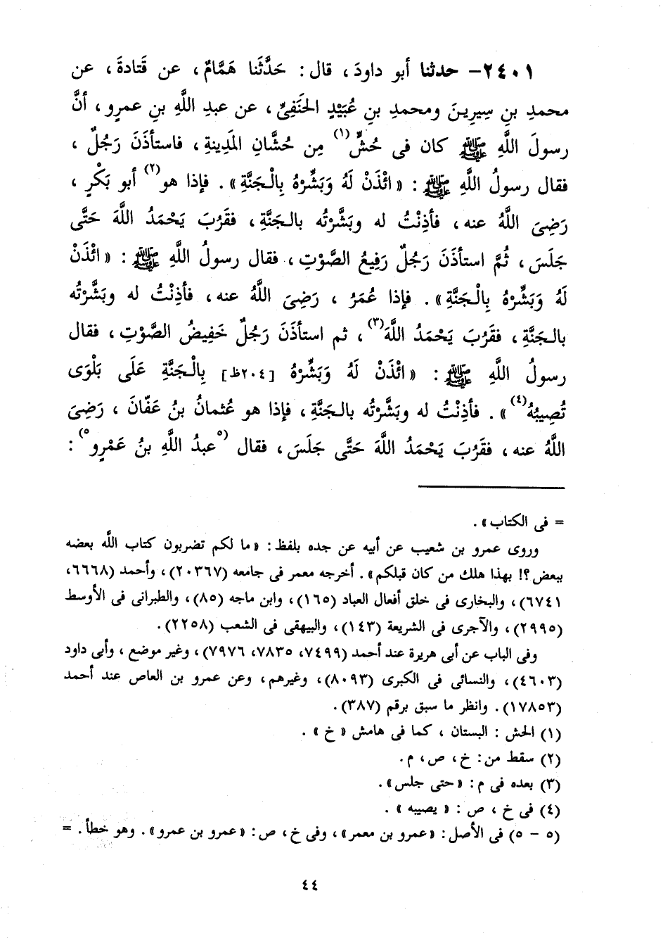 2401 - حَدَّثَنَا أَبُو دَاوُدَ قَالَ: حَدَّثَنَا هَمَّامٌ، عَنْ قَتَادَةَ، عَنْ مُحَمَّدِ بْنِ سِيرِينَ، وَمُحَمَّدِ بْنِ عُبَيْدٍ الْحَنَفِيِّ، عَنْ عَبْدِ اللَّهِ بْنِ عَمْرٍو، أَنَّ رَسُولَ اللَّهِ صَلَّى اللهُ عَلَيْهِ وَسَلَّمَ كَانَ فِي حُشٍّ مِنْ حُشَّانِ الْمَدِينَةِ فَاسْتَأْذَنَ رَجُلٌ، فَقَالَ رَسُولُ اللَّهِ صَلَّى اللهُ عَلَيْهِ وَسَلَّمَ: «§ائْذَنْ لَهُ وَبَشِّرْهُ بِالْجَنَّةِ» فَإِذَا هُوَ أَبُو بَكْرٍ رَضِيَ اللَّهُ عَنْهُ فَأَذِنْتُ لَهُ وَبَشَّرْتُهُ بِالْجَنَّةِ، فَقَرُبَ يَحْمَدُ اللَّهَ حَتَّى جَلَسَ، ثُمَّ اسْتَأْذَنَ رَجُلٌ رَفِيعُ الصَّوْتِ، فَقَالَ رَسُولُ اللَّهِ صَلَّى اللهُ عَلَيْهِ وَسَلَّمَ: «ائْذَنْ لَهُ وَبَشِّرْهُ بِالْجَنَّةِ» فَإِذَا عُمَرُ رَضِيَ اللَّهُ عَنْهُ، فَأَذِنْتُ لَهُ وَبَشَّرْتُهُ بِالْجَنَّةِ، فَقَرُبَ يَحْمَدُ اللَّهَ، ثُمَّ اسْتَأْذَنَ رَجُلٌ خَفِيضُ الصَّوْتِ، فَقَالَ رَسُولُ اللَّهِ صَلَّى اللهُ عَلَيْهِ وَسَلَّمَ: «ائْذَنْ لَهُ وَبَشِّرْهُ بِالْجَنَّةِ عَلَى بَلْوَى تُصِيبُهُ» فَأَذِنْتُ لَهُ وَبَشَّرْتُهُ بِالْجَنَّةِ، فَإِذَا هُوَ عُثْمَانُ بْنُ عَفَّانَ رَضِيَ اللَّهُ عَنْهُ، فَقَرُبَ يَحْمَدُ اللَّهَ حَتَّى جَلَسَ، فَقَالَ عَبْدُ اللَّهِ بْنُ عَمْرٍو -[45]-، أَيْنَ أَنَا؟ قَالَ: «أَنْتَ مَعَ أَبِيكَ»
