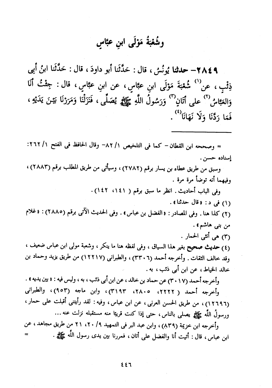 2849 - حَدَّثَنَا يُونُسُ قَالَ: حَدَّثَنَا أَبُو دَاوُدَ قَالَ: حَدَّثَنَا ابْنُ أَبِي ذِئْبٍ، عَنْ شُعْبَةَ مَوْلَى ابْنِ عَبَّاسٍ عَنِ ابْنِ عَبَّاسٍ، قَالَ: «جِئْتُ أَنَا وَالْعَبَّاسُ، عَلَى أَتَانٍ، وَرَسُولُ اللَّهِ صَلَّى اللهُ عَلَيْهِ وَسَلَّمَ يُصَلِّي، §فَنَزَلْنَا وَمَرَرْنَا بَيْنَ يَدَيْهِ، فَمَا رَدَّنَا وَلَا نَهَانَا»
