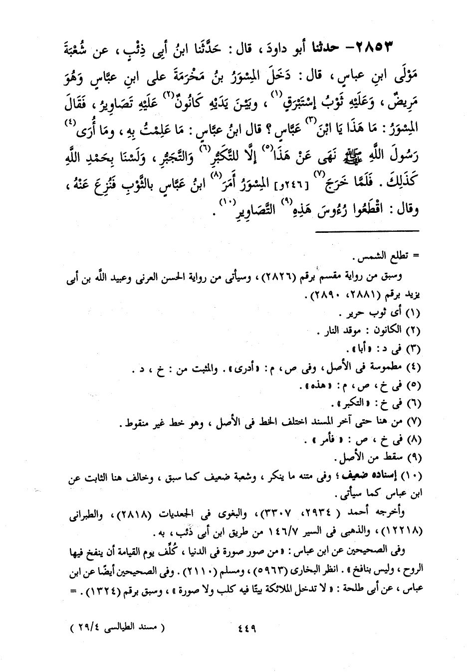 2853 - حَدَّثَنَا أَبُو دَاوُدَ قَالَ: حَدَّثَنَا ابْنُ أَبِي ذِئْبٍ، عَنْ شُعْبَةَ مَوْلَى ابْنِ عَبَّاسٍ قَالَ: دَخَلَ الْمِسْوَرُ بْنُ مَخْرَمَةَ عَلَى ابْنِ عَبَّاسٍ وَهُوَ مَرِيضٌ وَعَلَيْهِ ثَوْبُ إِسْتَبْرَقٍ، وَبَيْنَ يَدَيْهِ كَانُونٌ عَلَيْهِ تَصَاوِيرُ، فَقَالَ الْمِسْوَرُ: مَا هَذَا يَا ابْنَ عَبَّاسٍ؟، قَالَ ابْنُ عَبَّاسٍ: مَا عَلِمْتُ بِهِ §وَمَا أَرَى رَسُولَ اللَّهِ صَلَّى اللهُ عَلَيْهِ وَسَلَّمَ نَهَى عَنْ هَذَا إِلَّا لِلتَّكَبُّرِ وَالتَّجَبُّرِ " وَلَسْنَا بِحَمْدِ اللَّهِ كَذَلِكَ فَلَمَّا خَرَجَ الْمِسْوَرُ أَمَرَ ابْنُ عَبَّاسٍ بِالثَّوْبِ فَنُزِعَ عَنْهُ، وَقَالَ: اقْطَعُوا رُءُوسَ هَذِهِ التَّصَاوِيرِ