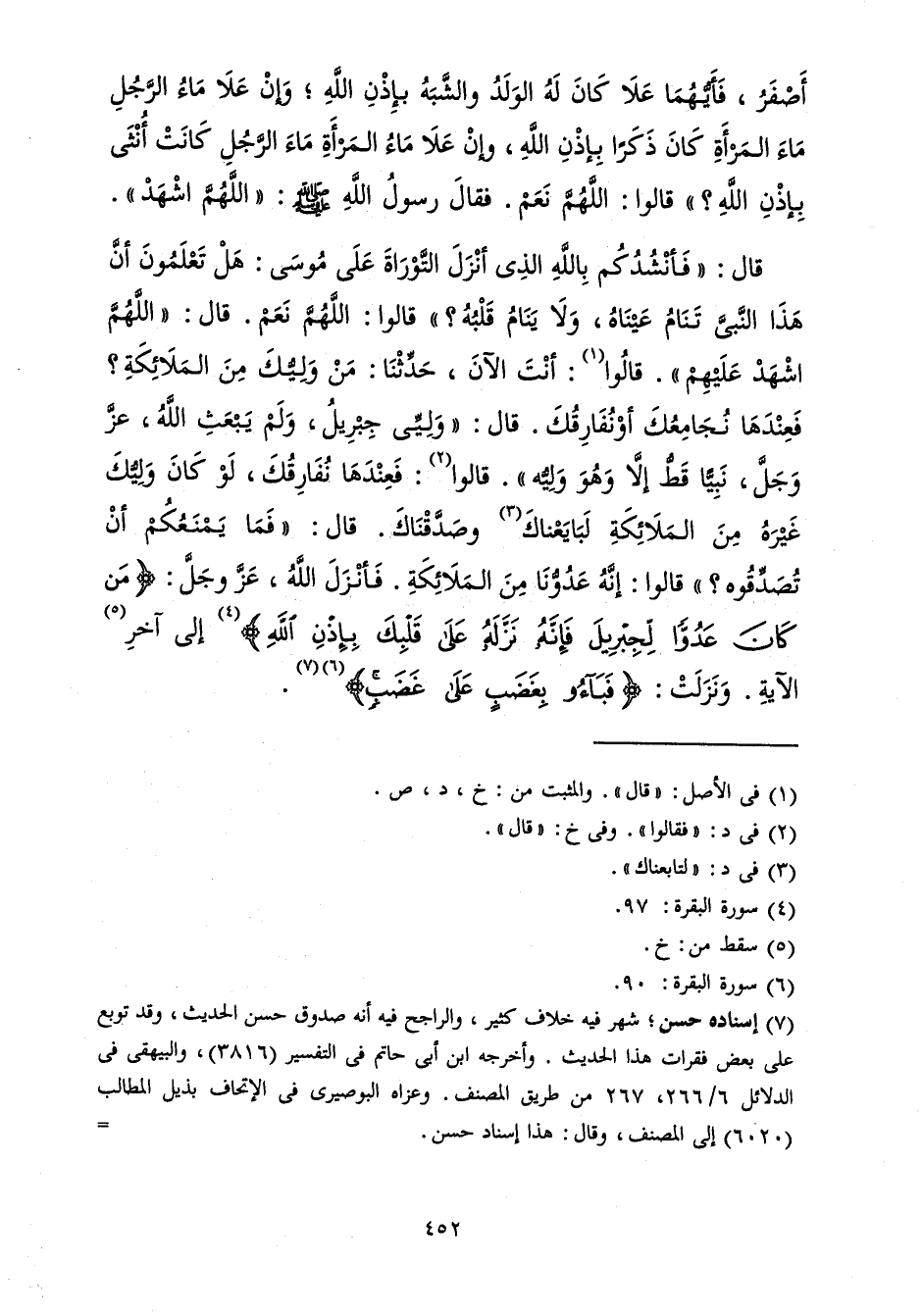 قَالَ: فَأَنْشُدُكُمْ بِاللهِ الَّذِي أَنْزَلَ التَّوْرَاةَ عَلَى مُوسَى، هَلْ تَعْلَمُونَ أَنَّ هَذَا النَّبِيَّ تَنَامُ عَيْنَاهُ وَلاَ يَنَامُ قَلْبُهُ؟ قَالُوا: اللهُمَّ نَعَمْ، قَالَ: اللهُمَّ اشْهَدْ عَلَيْهِمْ، قَالُوا: أَنْتَ الآنَ، حَدِّثْنَا مَنْ وَلِيُّكَ مِنَ الْمَلاَئِكَةِ، فَعِنْدَهَا نُجَامِعُكَ، أَوْ نُفَارِقُكَ، قَالَ: وَلِيِّيَ جِبْرِيلُ، وَلَمْ يَبْعَثِ اللهُ عَزَّ وَجَلَّ نَبِيًّا قَطُّ إِلاَّ وَهُوَ وَلِيُّهُ، قَالُوا: فَعِنْدَهَا نُفَارِقُكَ، لَوْ كَانَ وَلِيُّكَ غَيْرَهُ مِنَ الْمَلاَئِكَةِ لَبَايَعْنَاكَ وَصَدَّقْنَاكَ، قَالَ: فَمَا يَمْنَعُكُمْ أَنْ تُصَدِّقُوهُ؟ قَالُوا: إِنَّهُ عَدُوُّنَا مِنَ الْمَلاَئِكَةِ، فَأَنْزَلَ اللهُ عَزَّ وَجَلَّ: {مَنْ كَانَ عَدُوًّا لِجِبْرِيلَ فَإِنَّهُ نَزَّلَهُ عَلَى قَلْبِكَ بِإِذْنِ اللهِ} إِلَى آخِرِ الآيَةِ، وَنَزَلَتْ: {فَبَاؤُوا بِغَضَبٍ عَلَى غَضِبٍ}.