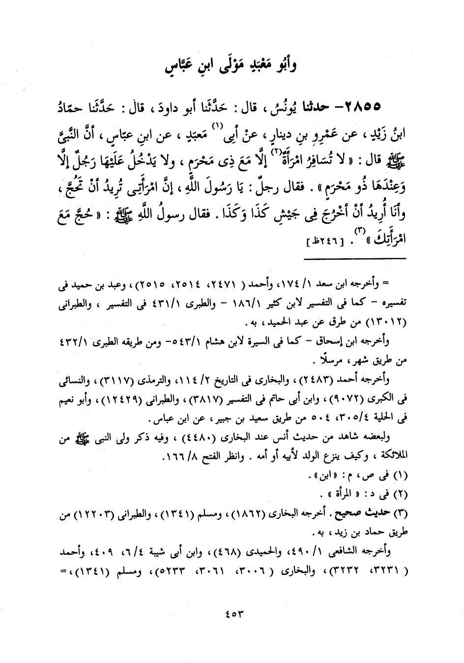 2855 - حَدَّثَنَا يُونُسُ قَالَ: حَدَّثَنَا أَبُو دَاوُدَ قَالَ: حَدَّثَنَا حَمَّادُ بْنُ زَيْدٍ، عَنْ عَمْرِو بْنِ دِينَارٍ، عَنْ أَبِي مَعْبَدٍ، عَنِ ابْنِ عَبَّاسٍ، أَنَّ النَّبِيَّ صَلَّى اللهُ عَلَيْهِ وَسَلَّمَ قَالَ: «§لَا تُسَافِرُ امْرَأَةٌ إِلَّا مَعَ ذِي مَحْرَمٍ، وَلَا يَدْخُلُ عَلَيْهَا رَجُلٌ إِلَّا وَعِنْدَهَا ذُو مَحْرَمٍ» فَقَالَ رَجُلٌ: يَا رَسُولَ اللَّهِ، إِنَّ امْرَأَتِيَ تُرِيدُ أَنْ تَحُجَّ، وَأَنَا أُرِيدُ أَنْ أَخْرُجَ فِي جَيْشِ كَذَا وَكَذَا فَقَالَ رَسُولُ اللَّهِ صَلَّى اللهُ عَلَيْهِ وَسَلَّمَ: «حُجَّ مَعَ امْرَأَتِكَ»