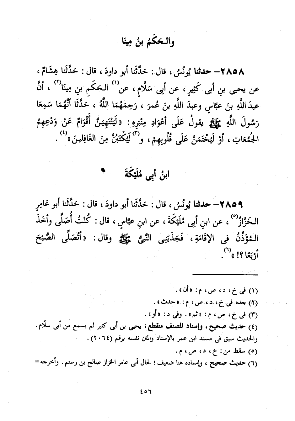 2858 - حَدَّثَنَا يُونُسُ قَالَ: حَدَّثَنَا أَبُو دَاوُدَ قَالَ: حَدَّثَنَا هِشَامٌ، عَنْ يَحْيَى بْنِ أَبِي كَثِيرٍ، عَنْ أَبِي سَلَّامٍ، عَنِ الْحَكَمَ بْنَ مِينَا، أَنَّ عَبْدَ اللَّهِ بْنَ عَبَّاسٍ، وَعَبْدَ اللَّهِ بْنَ عُمَرَ رَحِمَهُمُ اللَّهُ حَدَّثَا أَنَّهُمَا، سَمِعَا رَسُولَ اللَّهِ صَلَّى اللهُ عَلَيْهِ وَسَلَّمَ يَقُولُ عَلَى أَعْوَادِ مِنْبَرِهِ: «§لَيَنْتَهِيَنَّ أَقْوَامٌ عَنْ وَدْعِهِمُ الْجُمُعَاتِ أَوْ لَيُخْتَمَنَّ عَلَى قُلُوبِهِمْ، وَلَيُكْتَبُنَّ مِنَ الْغَافِلِينَ»